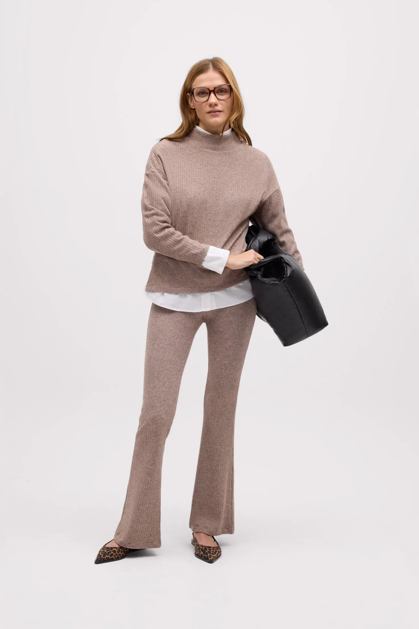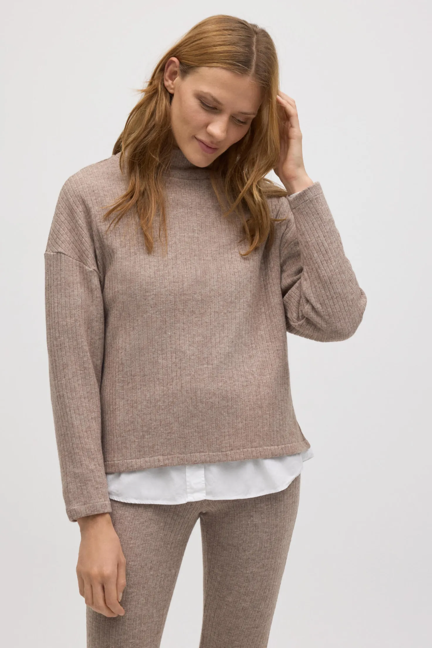 Este jersey cálido de punto canalé con cuello es una opción versátil para los días más fríos. Su textura de canalé aporta un toque delicado y moderno, mientras que su corte amplio lo convierte en una prenda extremadamente cómoda. Pensado para quienes buscan ropa cómoda y con estilo para el día a día.