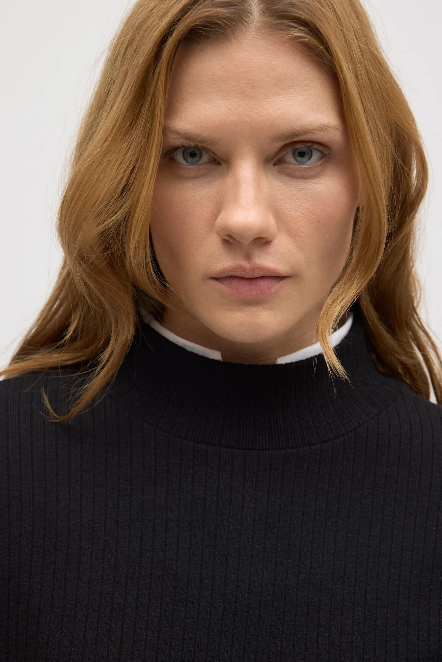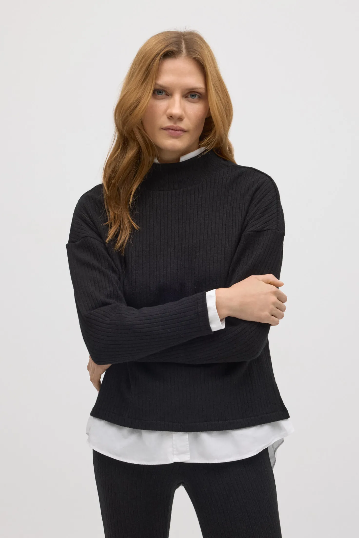 Este jersey cálido de punto canalé con cuello es una opción versátil para los días más fríos. Su textura de canalé aporta un toque delicado y moderno, mientras que su corte amplio lo convierte en una prenda extremadamente cómoda. Pensado para quienes buscan ropa cómoda y con estilo para el día a día.