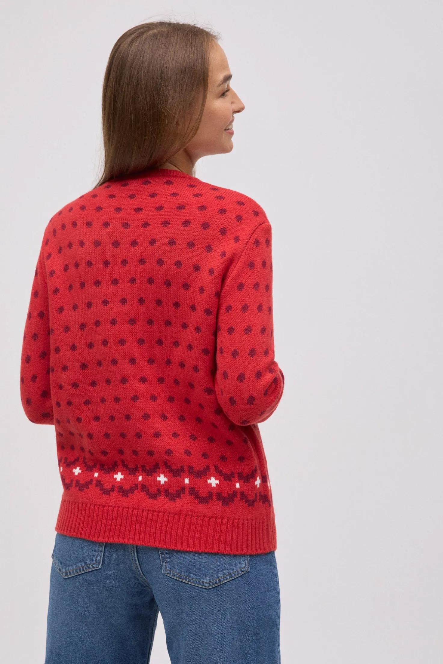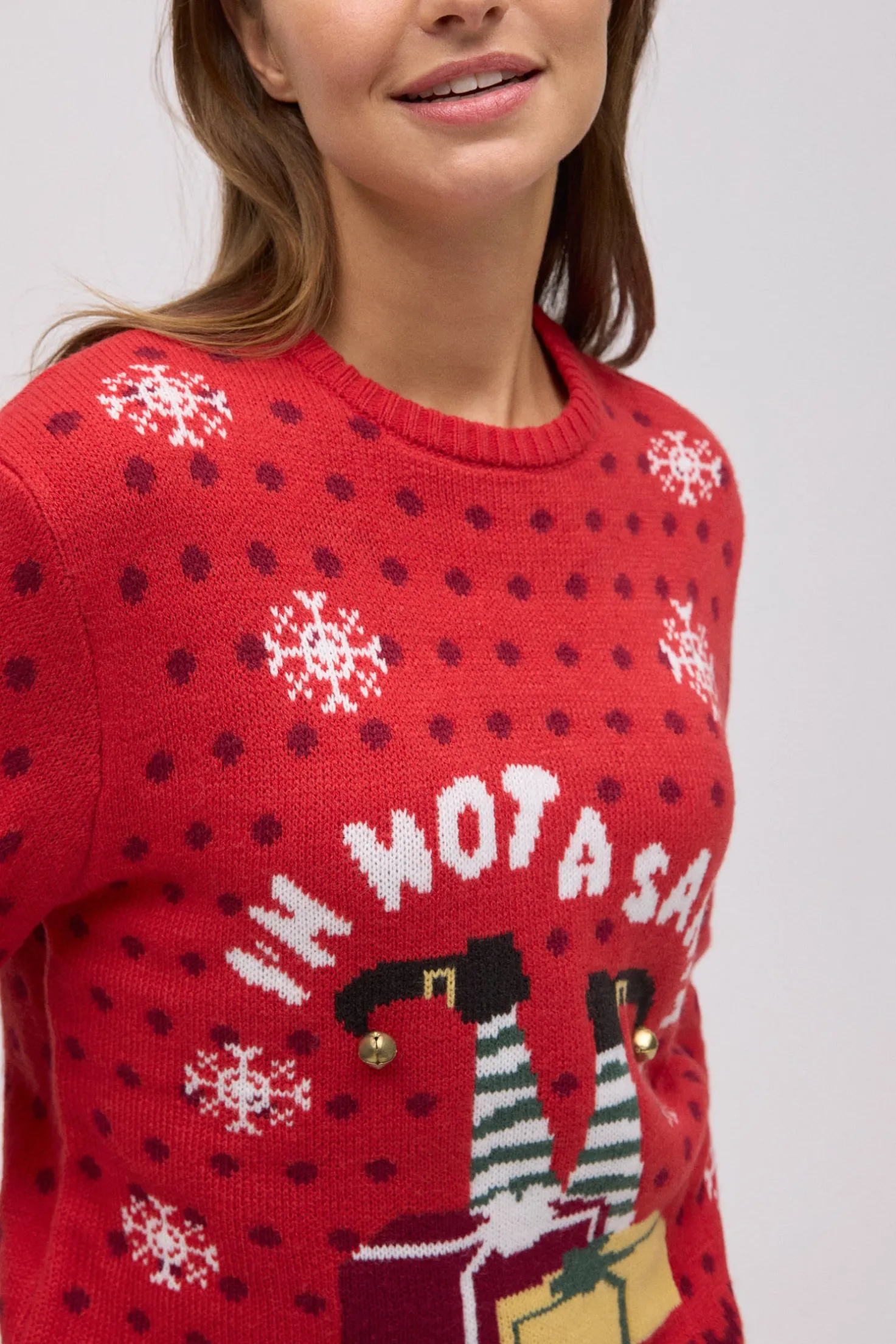 Este jersey navideño de mujer es ideal para disfrutar de las fiestas con un toque divertido y original. Con un diseño en color rojo, presenta el estampado de un elfo entre regalos, copos de nieve y el mensaje “I’m not a Santa”. Los cascabeles cosidos en relieve aportan sonido y dinamismo a cada paso, convirtiéndolo en el look perfecto para reuniones familiares, cenas o fiestas temáticas.