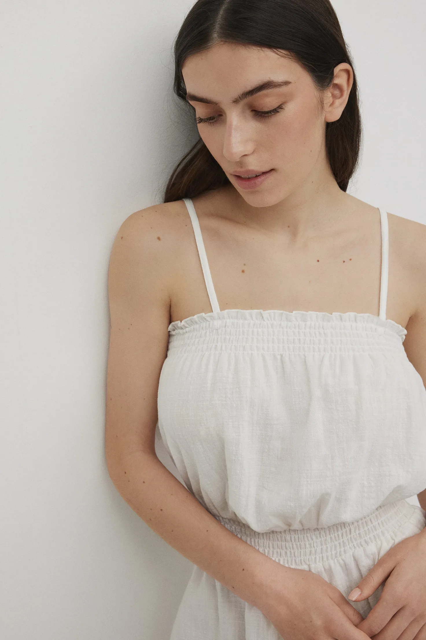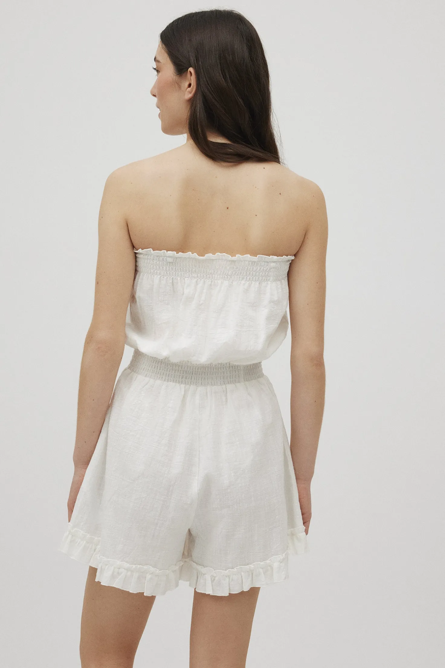 Mono bandeau blanco. Con tirantes desmontables y regulables que le dan versatilidad a la hora de usarlo. Ajustado en la cintura para realzar la figura. Prenda confeccionada con 100% algodón. Básico que no puede faltar en tu armario este verano.