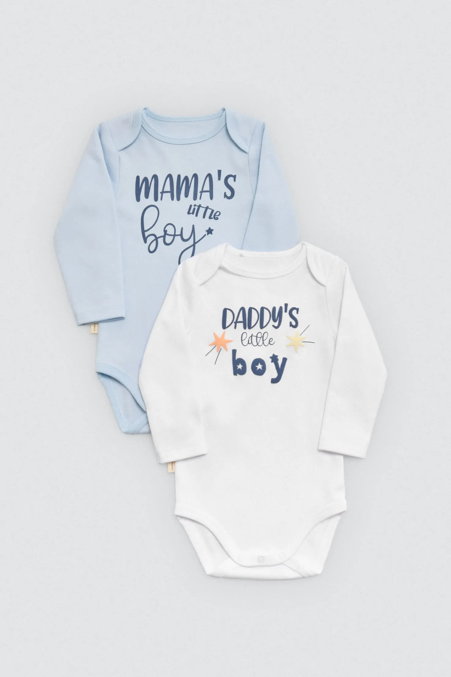 Set de 2 bodies de manga larga para bebé niño con interior afelpado. Tejido de algodón natural con mensajes estampados. Suaves, cómodos y perfectos para uso diario o regalar.