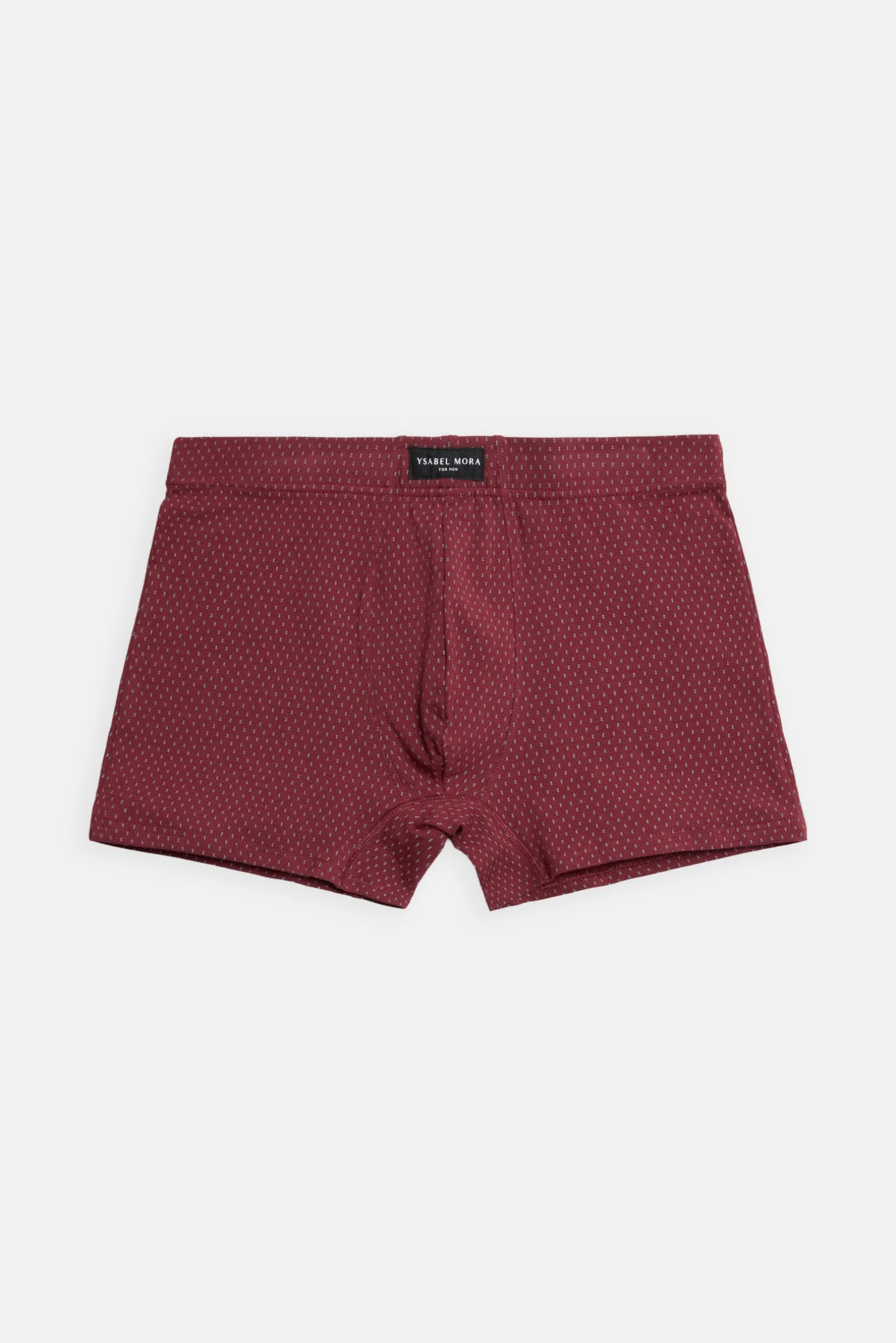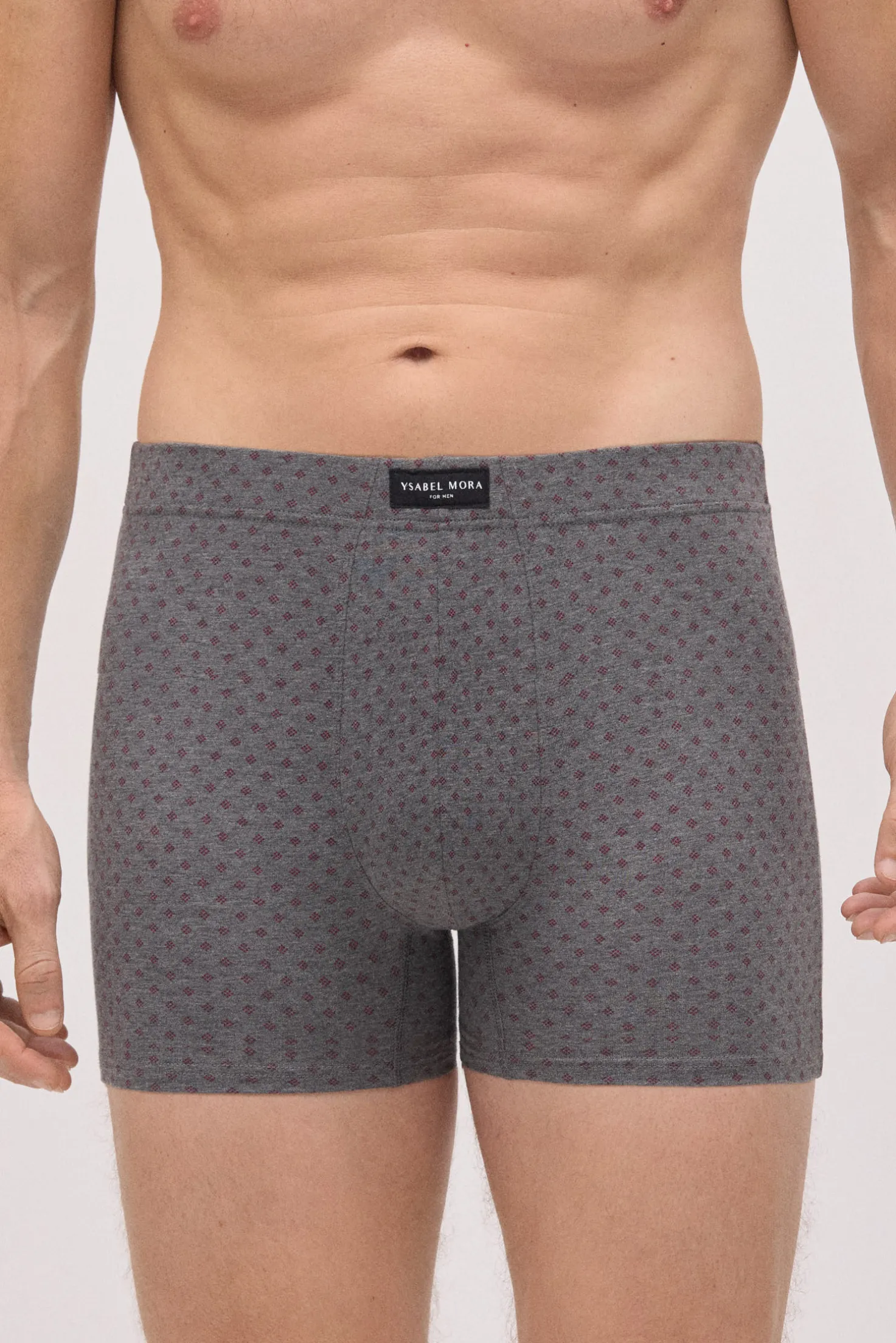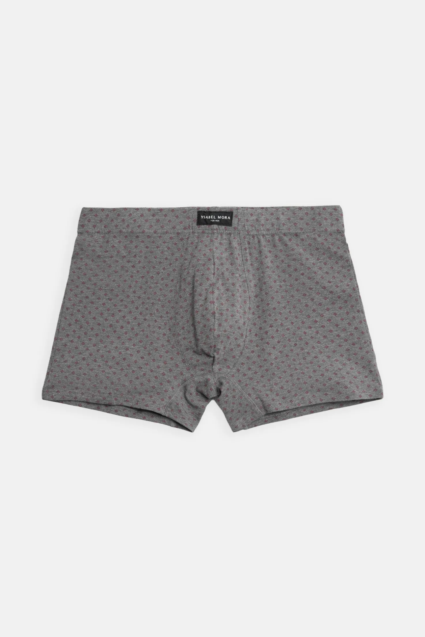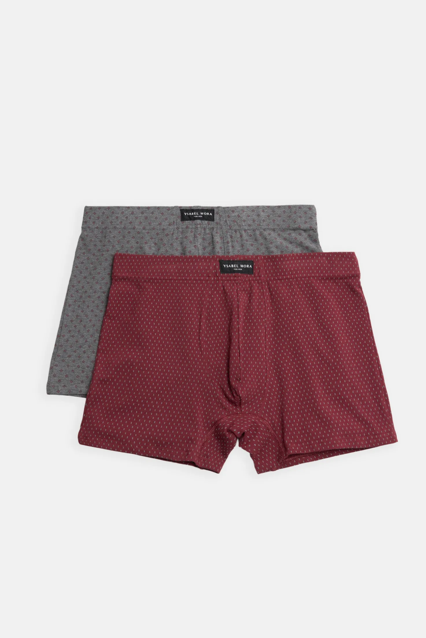 Pack de 2 bóxers estampados de Ysabel Mora confeccionados en algodón natural. Cada modelo presenta un diseño geométrico distinto en tonos burdeos y gris. La cinturilla elástica aporta sujeción, ideal para el uso diario.