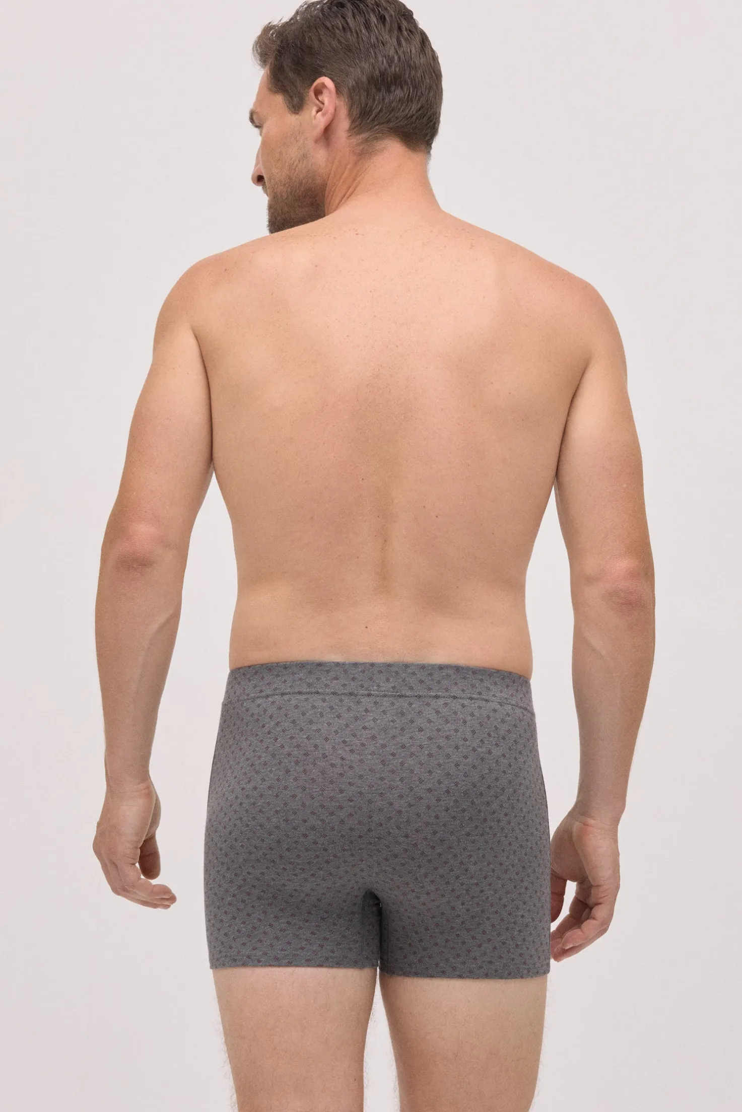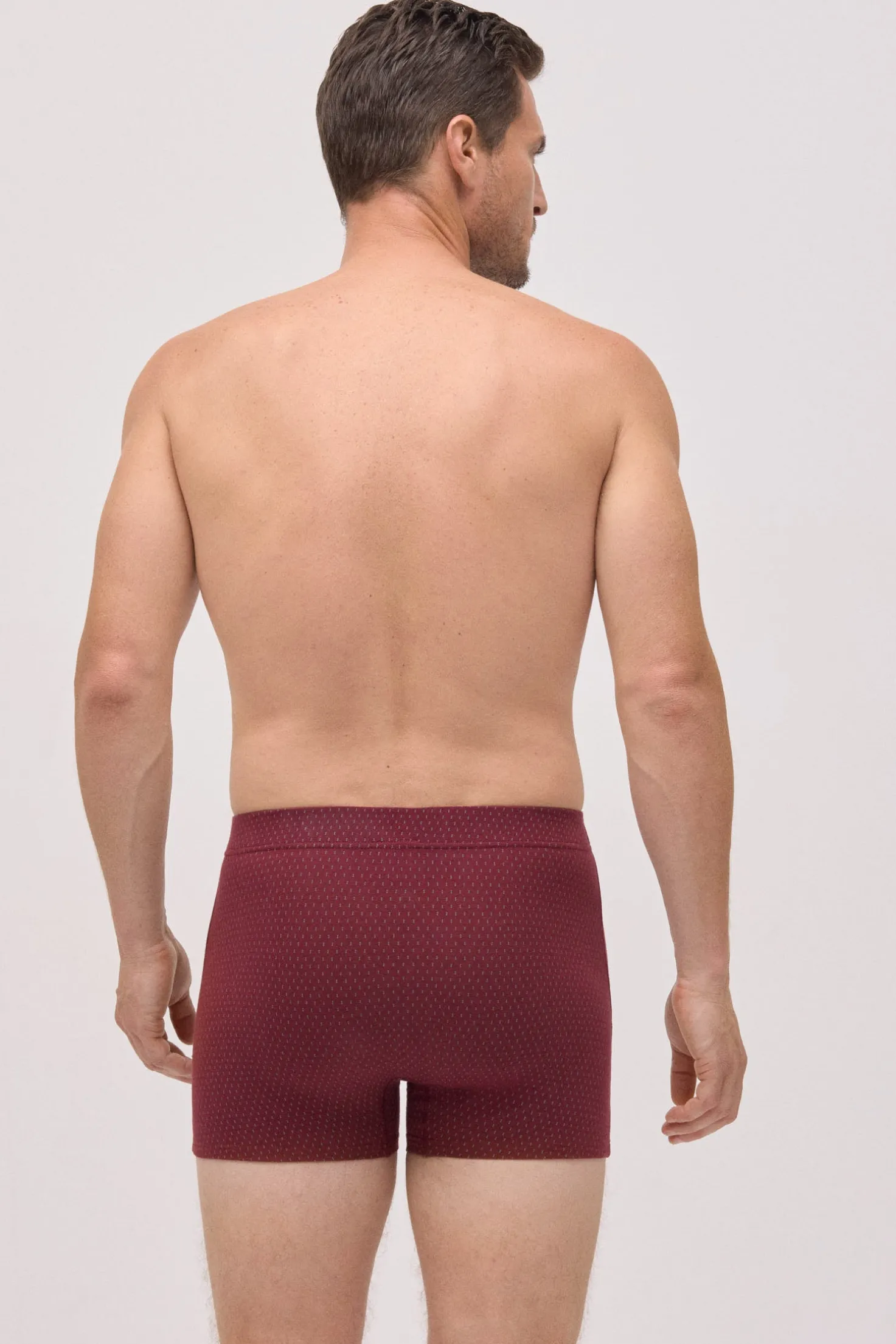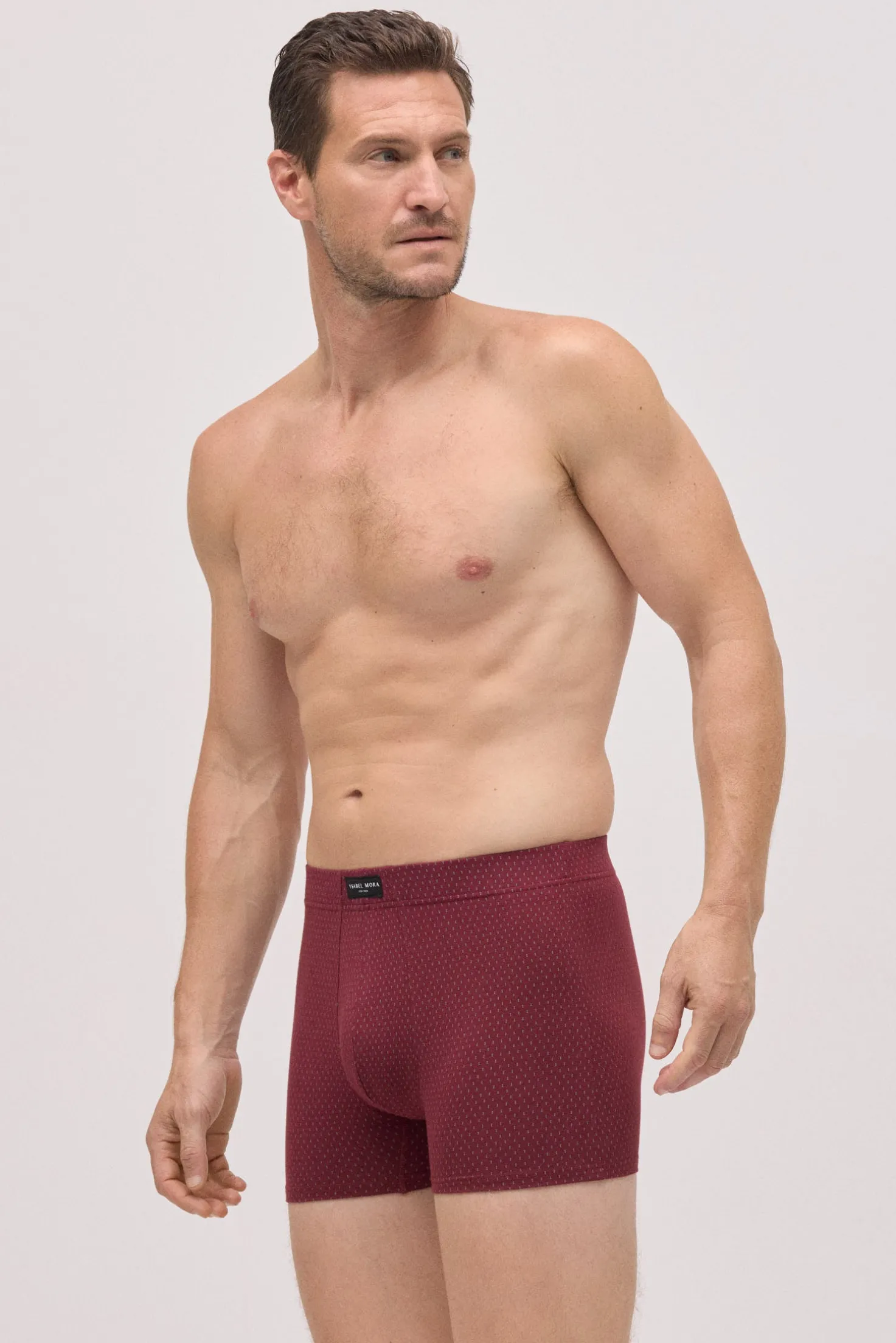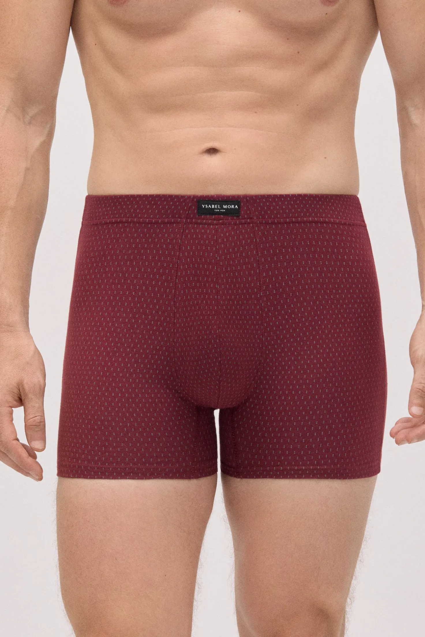 Pack de 2 bóxers estampados de Ysabel Mora confeccionados en algodón natural. Cada modelo presenta un diseño geométrico distinto en tonos burdeos y gris. La cinturilla elástica aporta sujeción, ideal para el uso diario.