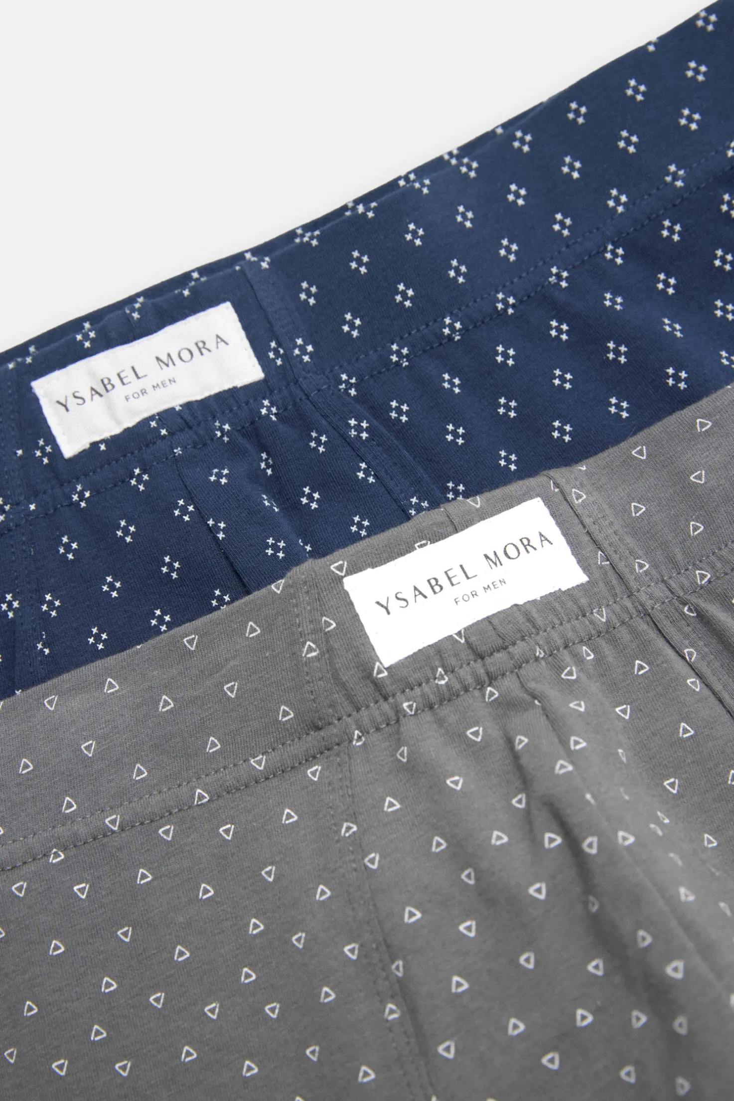 Pack de 2 bóxers estampados de Ysabel Mora confeccionados en algodón natural con un toque de elastano para mayor comodidad. Cada calzoncillo presenta un color y un estampado diferente: uno en gris y otro en azul marino. La cinturilla elástica aporta sujeción y un acabado funcional para el día a día.