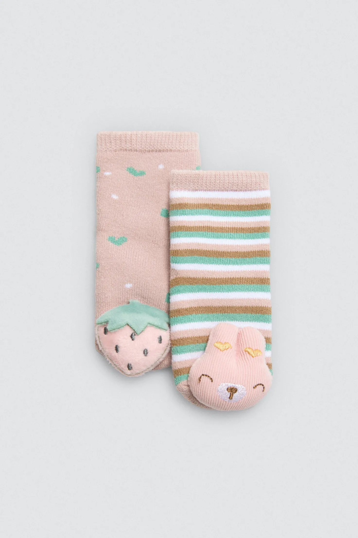 Pack de 2 pares de calcetines para bebé niña. Calcetines térmicos y estampados con aplique sensorial de sonajero. Puño antipresión.