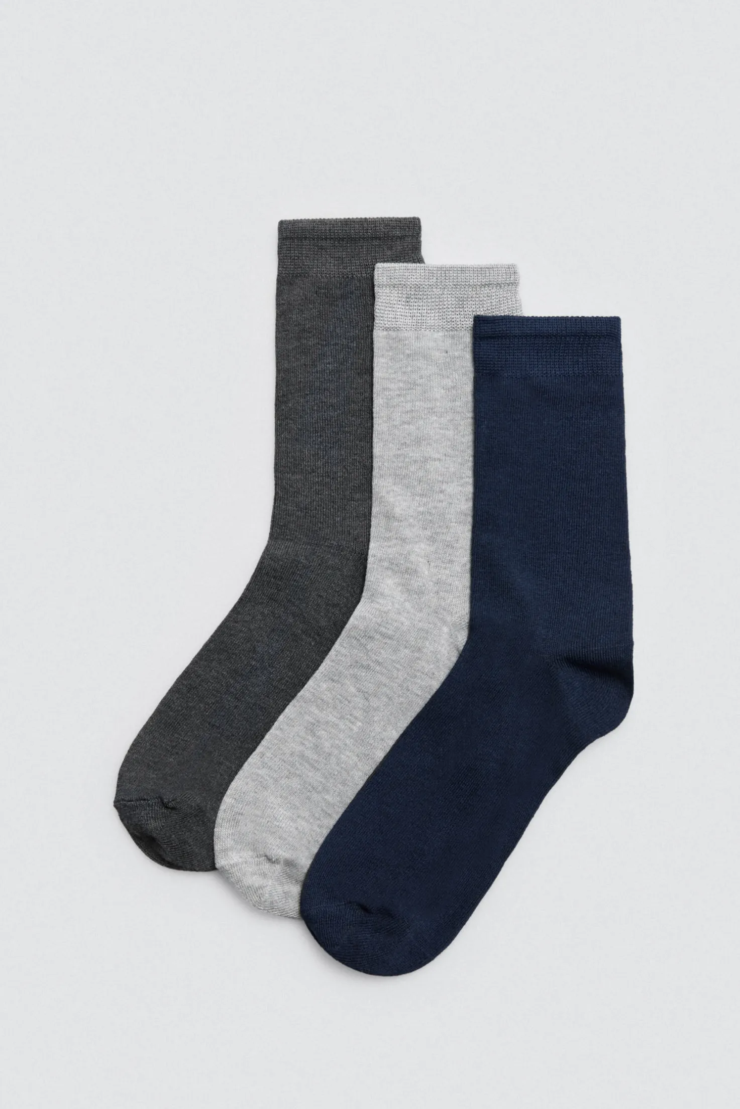 Pack de 3 pares de calcetines de bambú cálidos en colores neutros para mujer. El bambú es una fibra natural transpirable, antiolores, suave y cómoda. Puño antipresión. Incluye un par de calcetines de cada color: gris marengo, gris claro y azul marino.