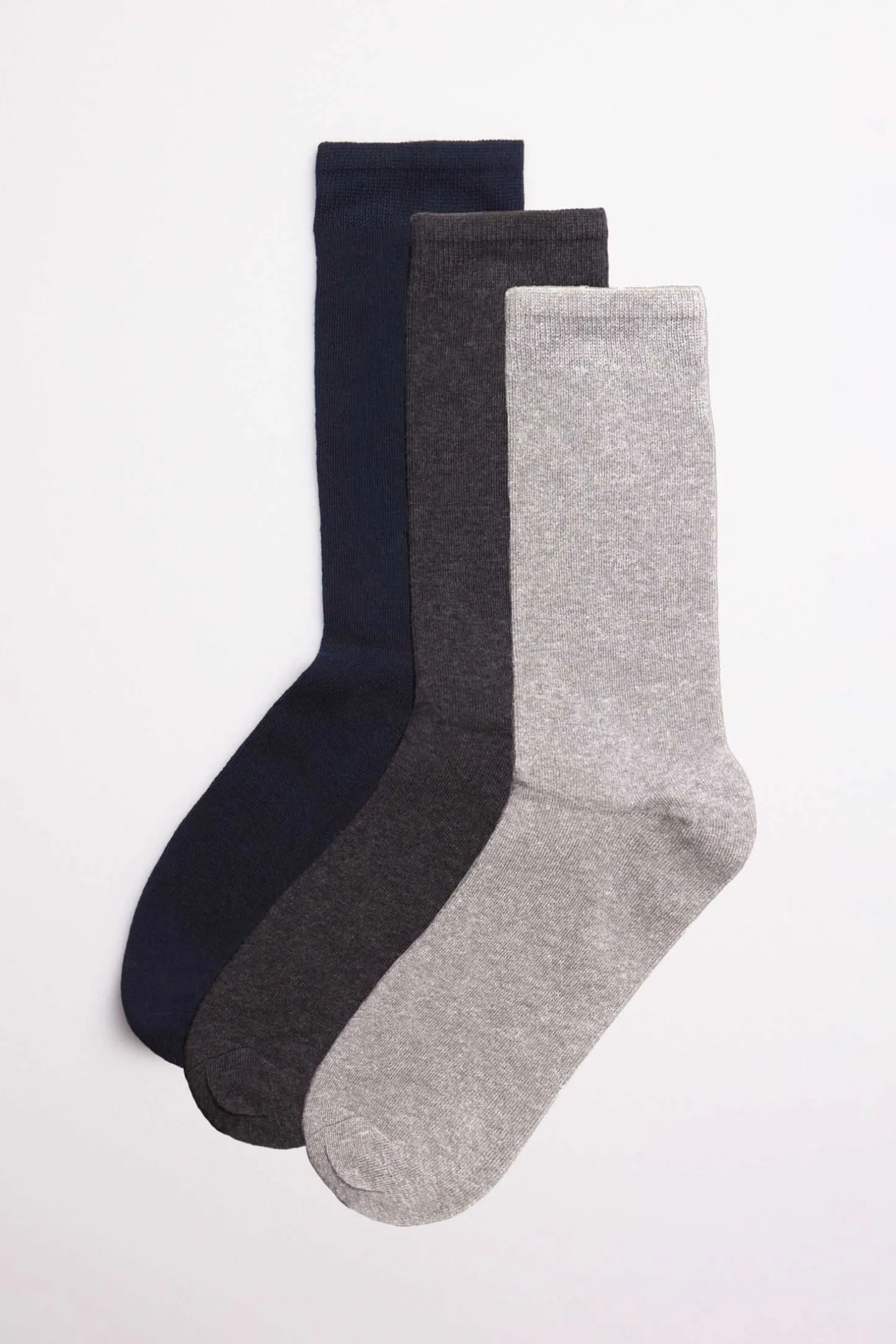 Pack de 3 pares de calcetines para hombre en tonos oscuros. Incluye un par de calcetines marino, un par gris marengo y un par gris claro. Confeccionados con algodón y sin puño antipresión. Comodidad para el día a día.