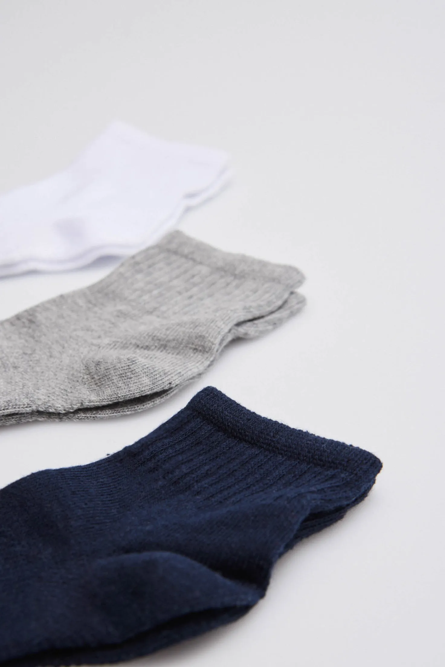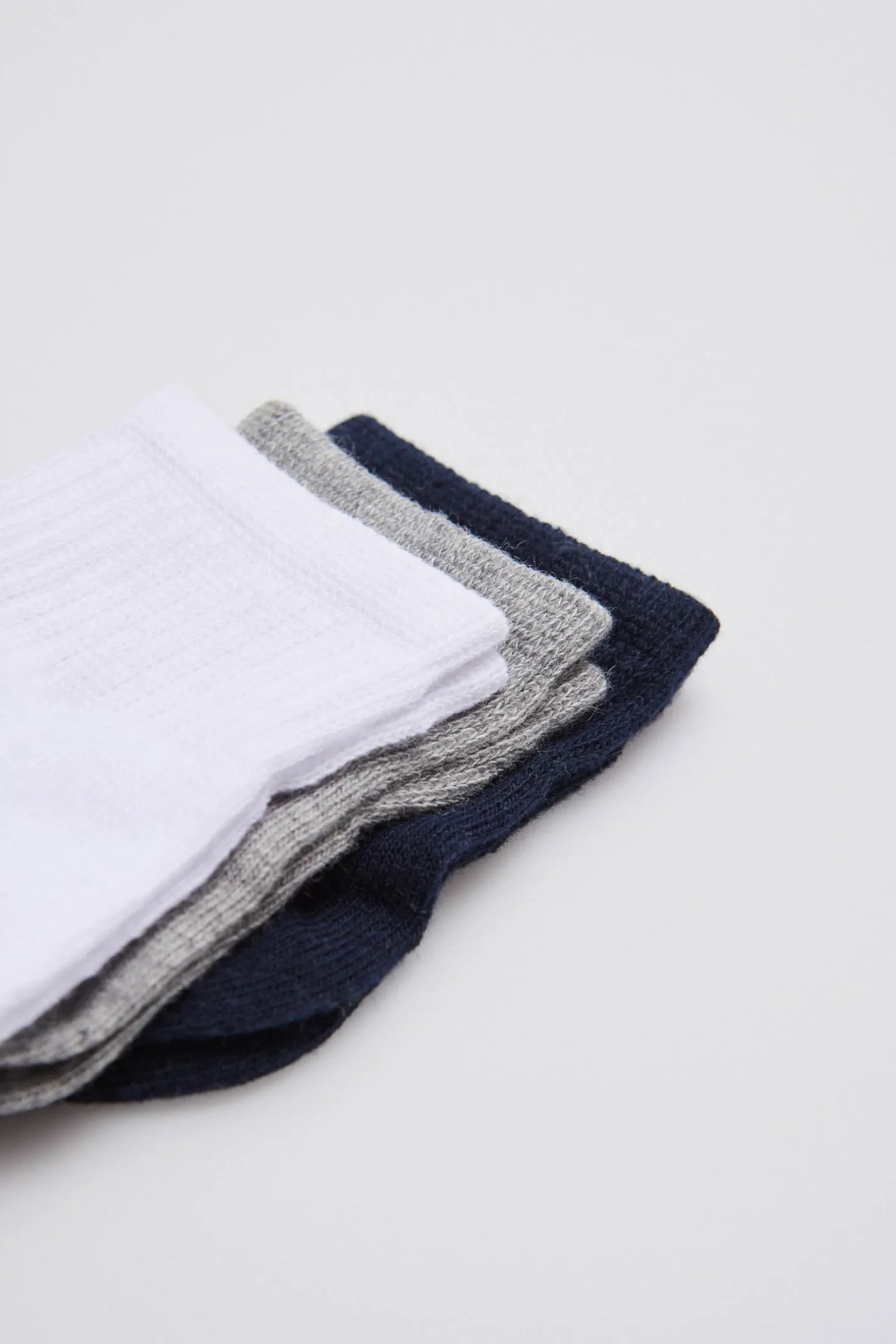 Tobillero infantil con efecto transpirable. Confeccionado con algodón y puño antipresión. Su tecnológica suela con microperforaciones favorece la transpiración del pie dándole una sensación de frescura y bienestar. Ideal para uso diario. Colores varios: incluye un par de calcetines blancos, un par de calcetines marino y un par de calcetines grises.