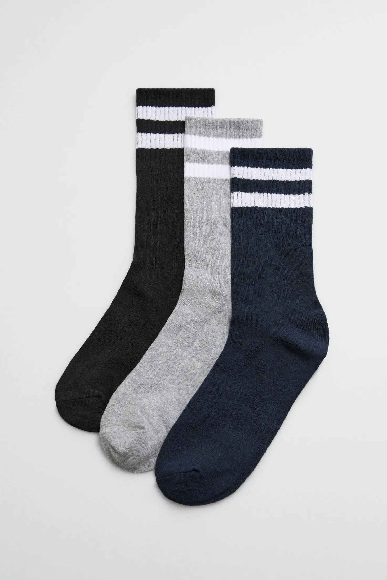 Pack 3 pares de calcetines deportivos puño a rayas tonos oscuros. Incluye uno de cada color. Unisex. Caña alta.