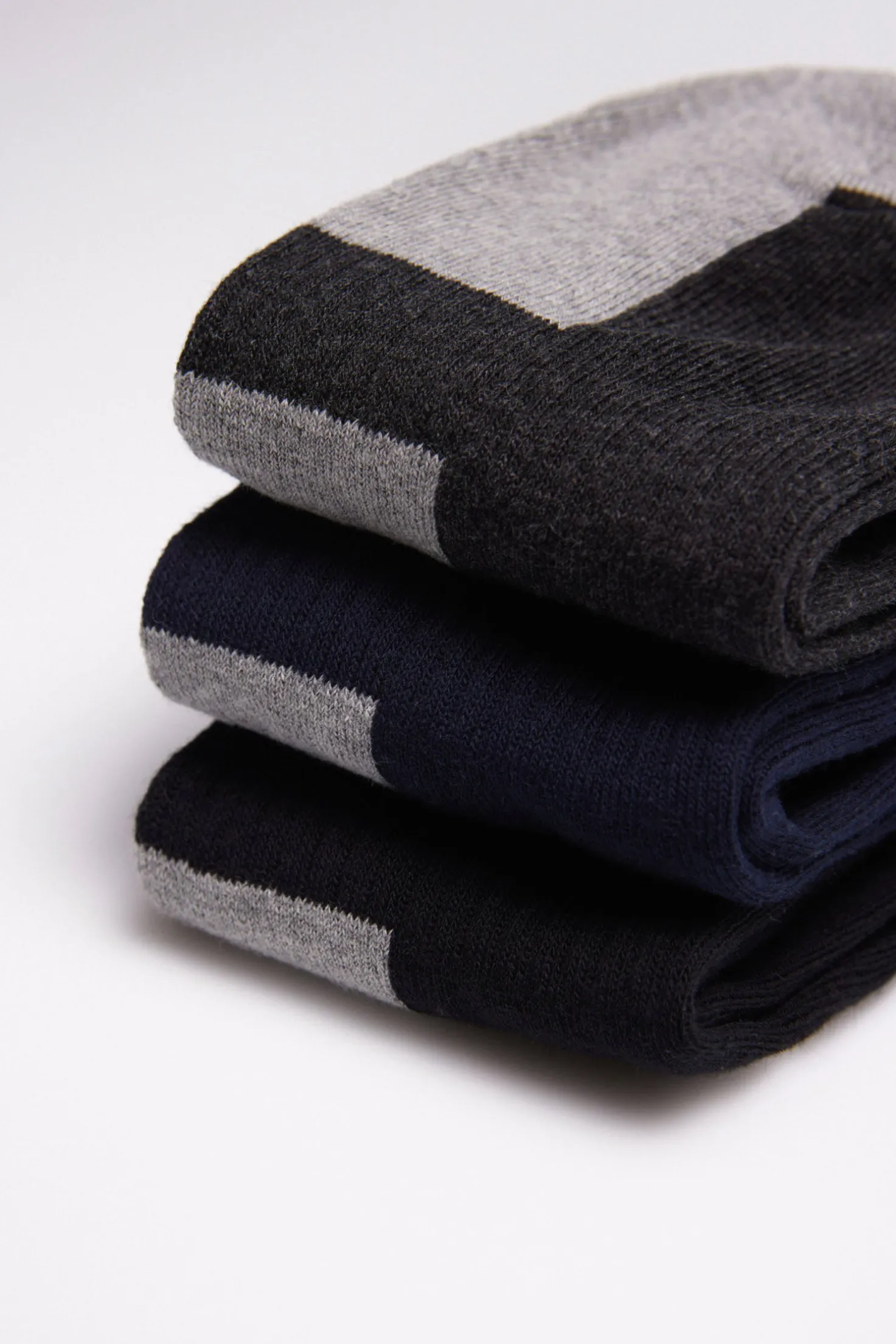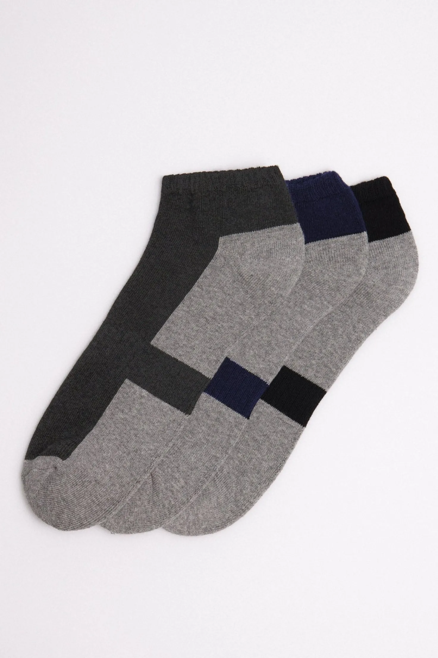Incluye un par de calcetines gris claro y negro, un par de calcetines gris claro y azul marino y otro par de color gris y gris marengo.