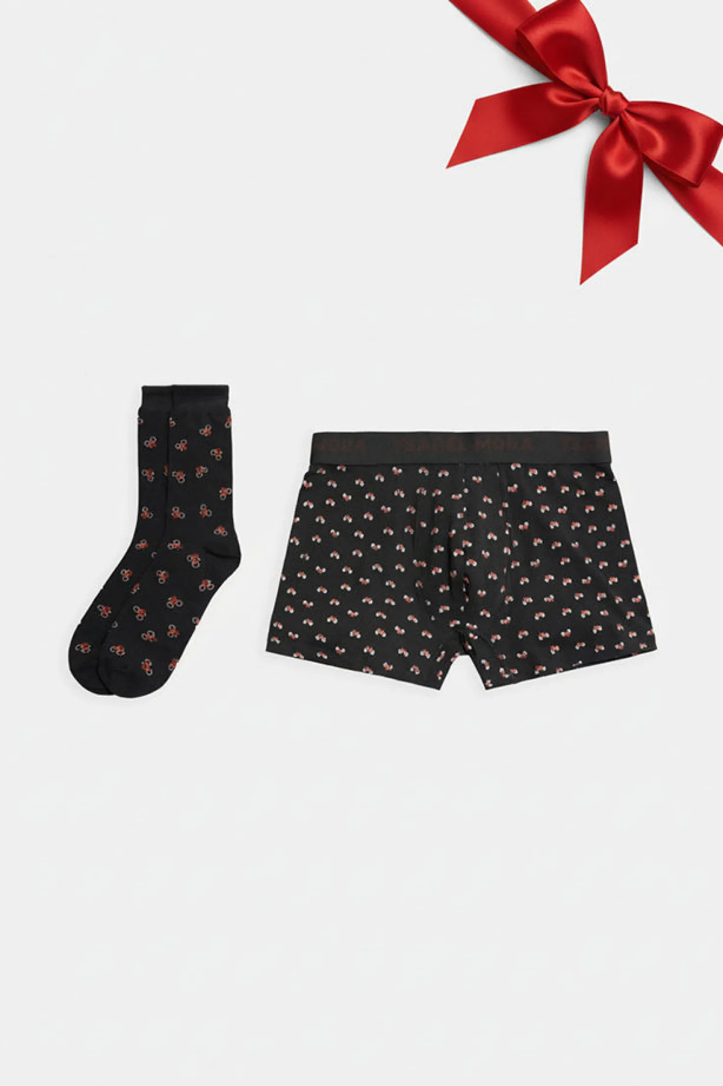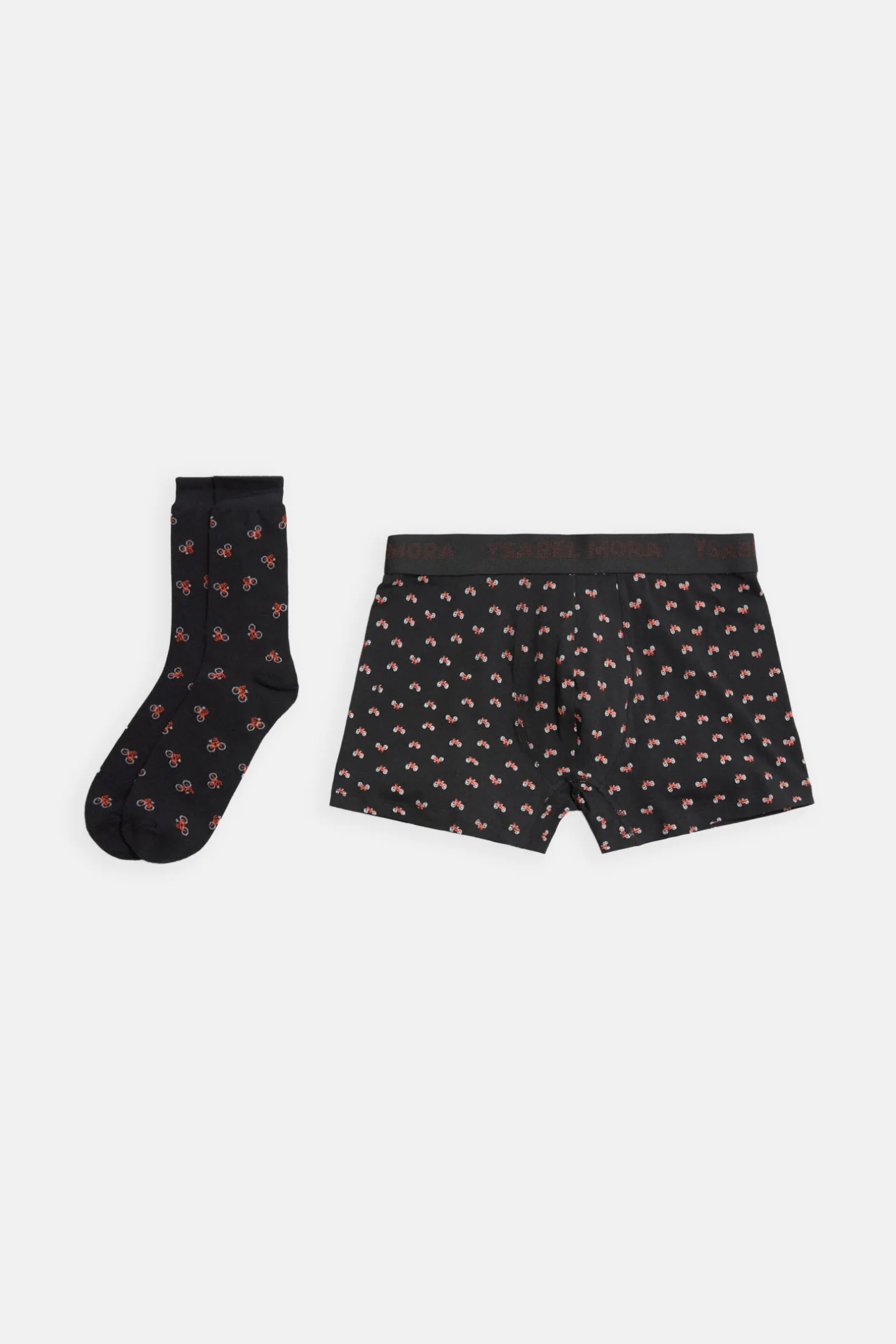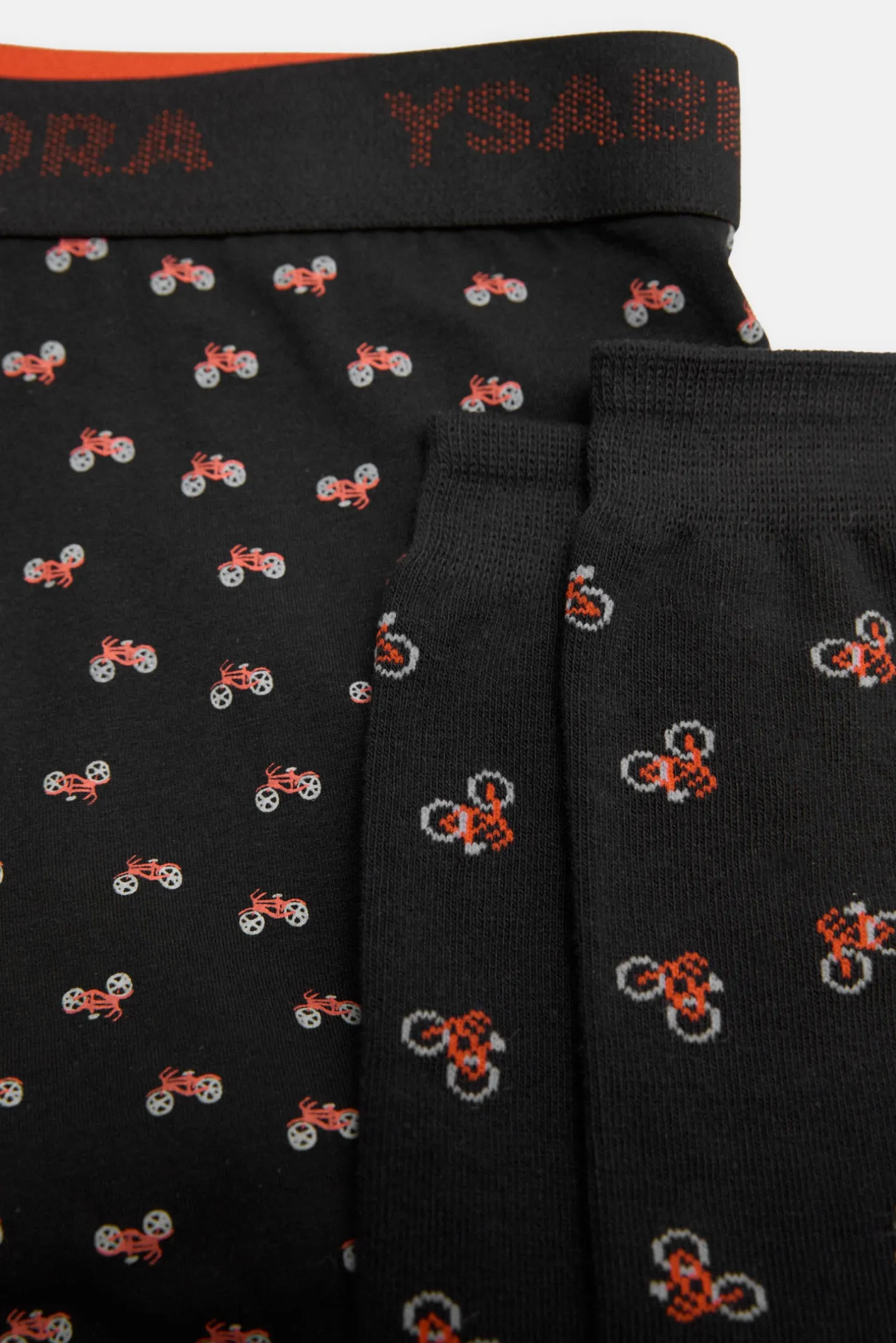 Pack de bóxer y calcetín de Ysabel Mora confeccionados en algodón natural para ofrecer confort y transpirabilidad durante todo el día. Ambos artículos comparten un original estampado de bicicletas sobre fondo oscuro, perfecto para los amantes de los pequeños detalles. Una opción divertida e ideal como pack regalo.