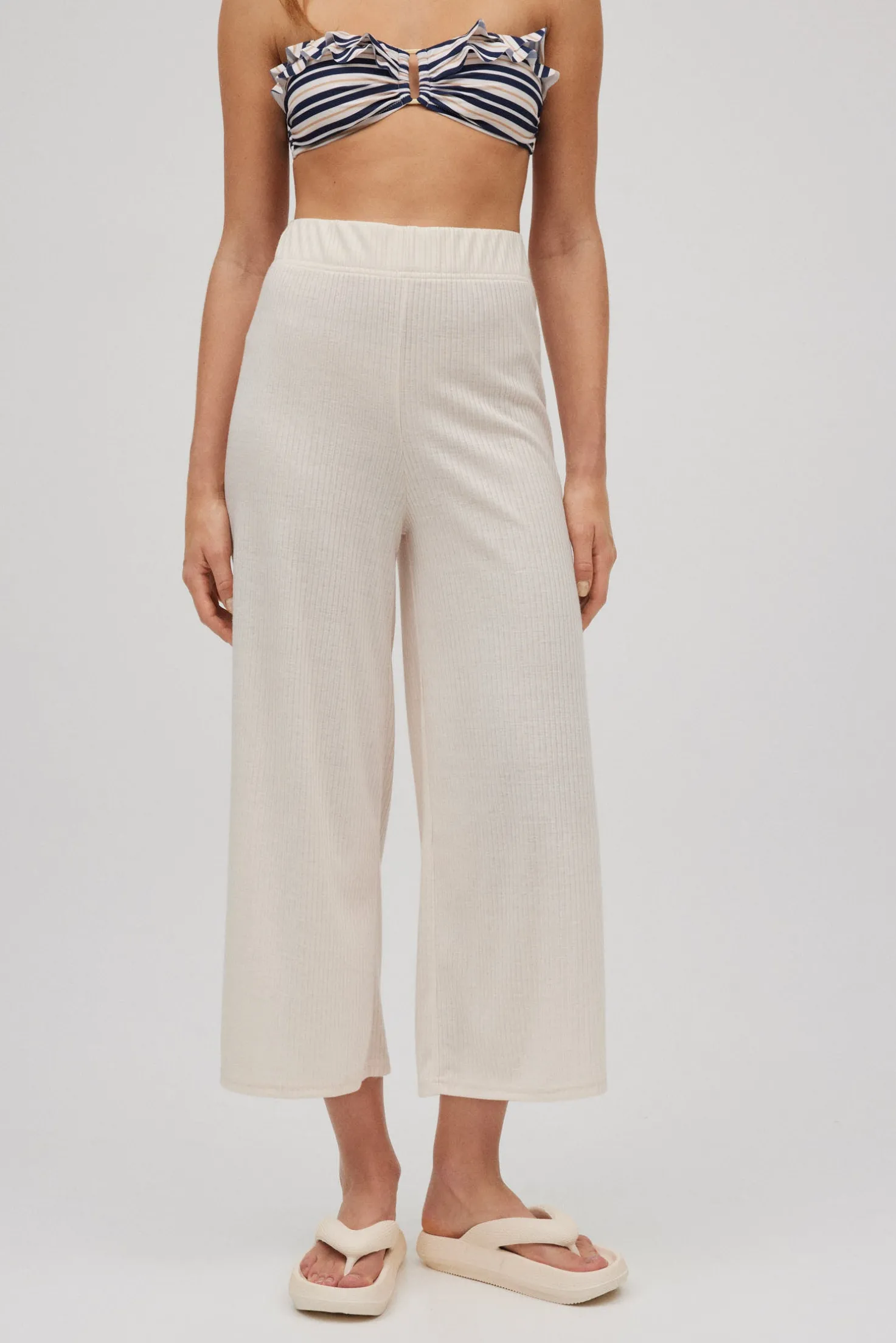Pantalones largos de tejido canalé. Corte ancho y cintura fruncida ajustada al cuerpo. Combínalos con la camisa a conjunto de la colección y completa tu look.