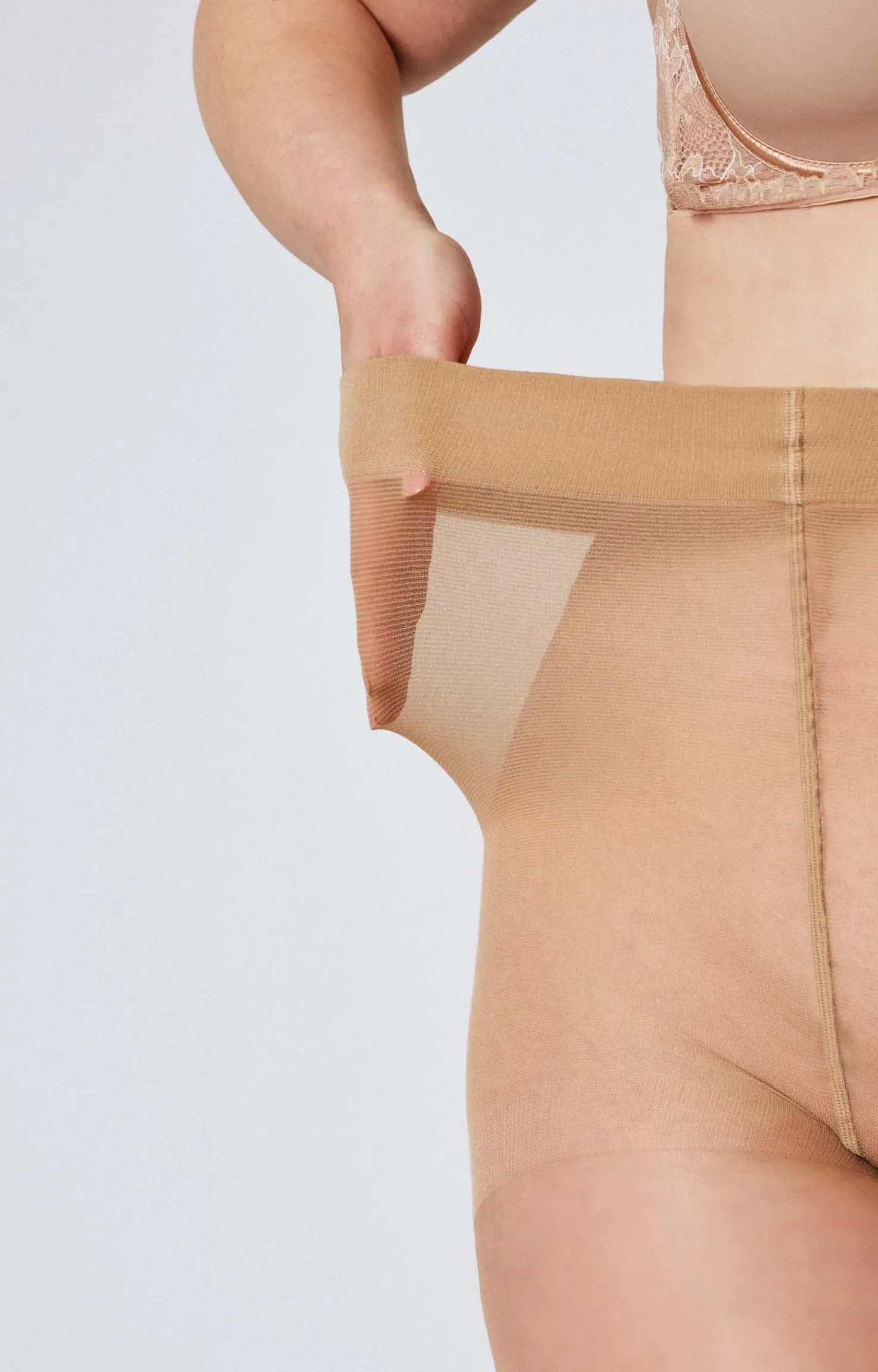 Panty para tallas plus de 15 Deniers, perfecto para entretiempo. Un panty básico, ahora en tallaje ampliado. Este panty super talla incorpora rombo superior para mayor comodidad. Color beige.