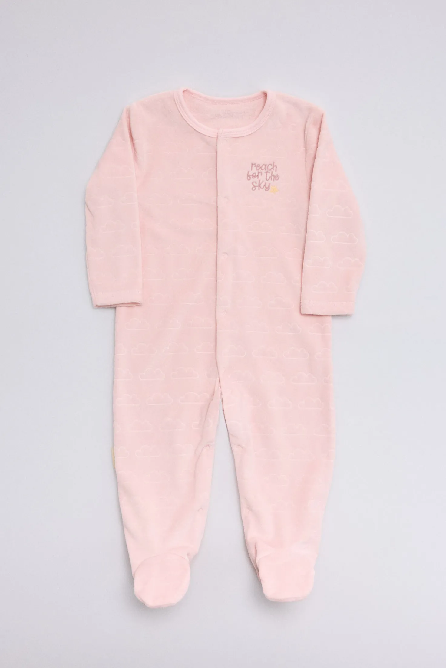 Pelele para bebé con manga larga y tejido afelpado suave. Incluye pies cerrados, Ideal para dormir o estar en casa. Diseño en tono rosa con detalle de estrellas.