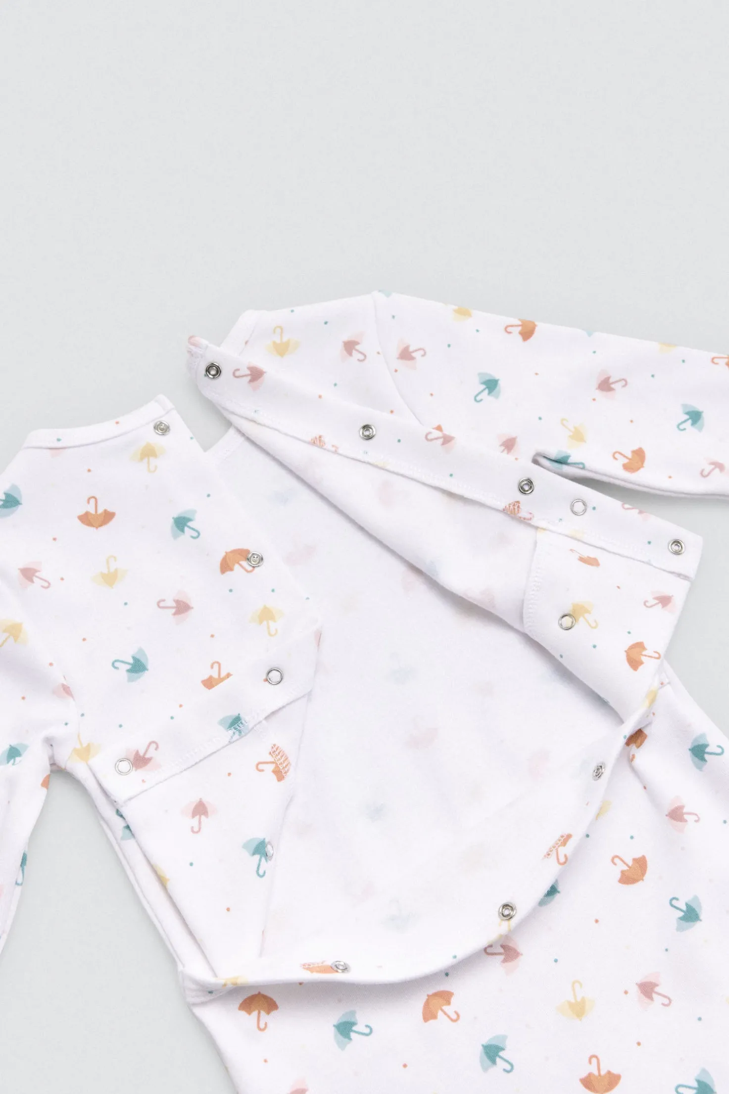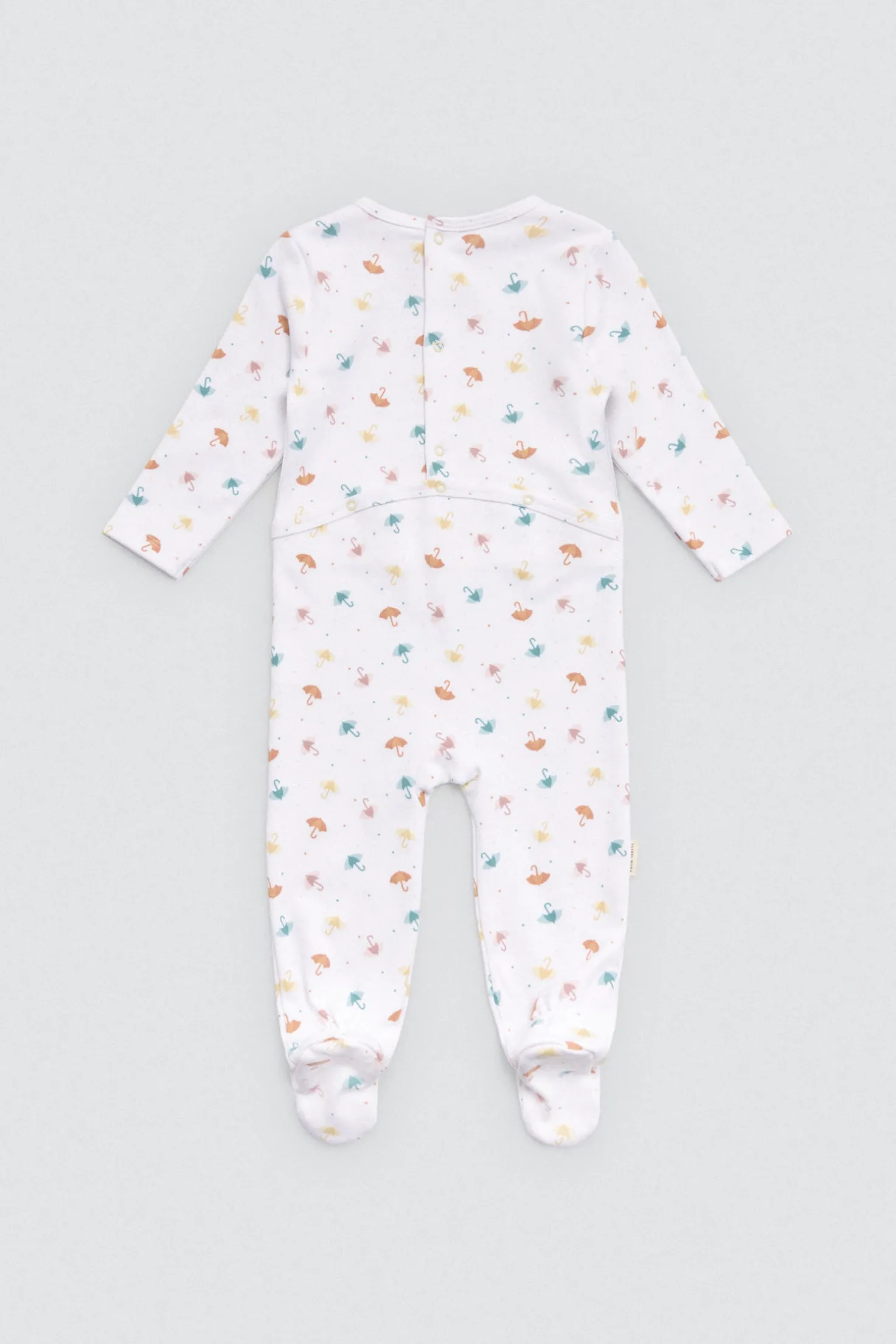 Pelele de manga larga para bebé con interior afelpado de algodón natural. Estampado de paraguas en tonos pastel. Cierre de botones trasero.