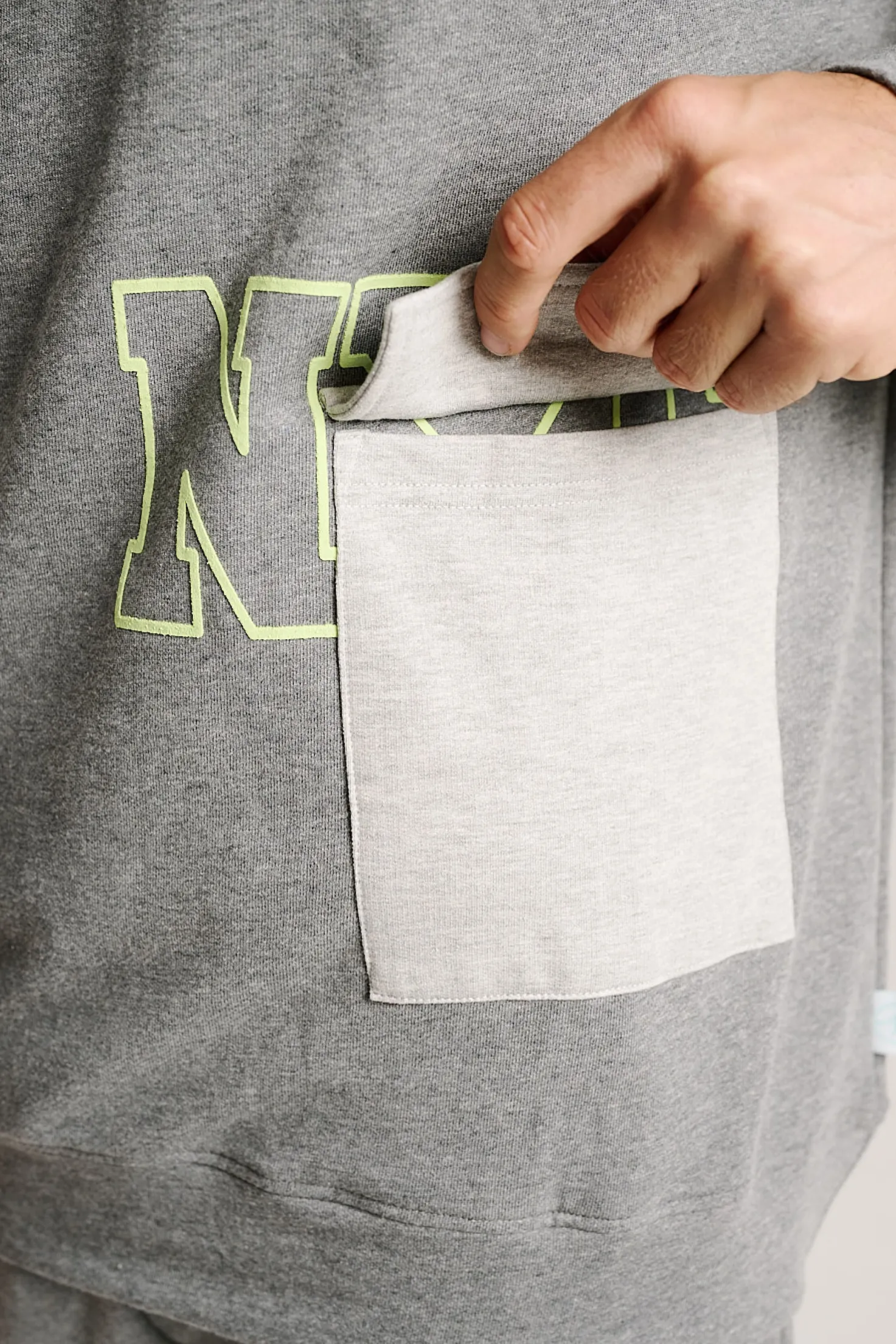 Pijama largo de hombre con un diseño urbano y funcional. La parte superior, estilo sudadera, luce un estampado “NYC” en contraste con detalle flocado y un práctico bolsillo tipo parche. El pantalón a juego, confeccionado en felpa perchada de tacto cálido y suave, incluye bolsillos laterales y cordón ajustable en la cintura. Una opción moderna y cómoda para el descanso diario.