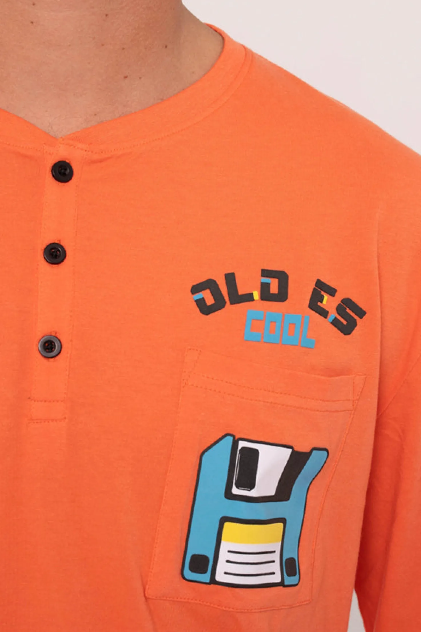 Conjunto de pijama de entretiempo compuesto por camiseta de manga larga y pantalón largo. Confeccionado con algodón. Tejido ligero, fresco y transpirable. Camiseta gráfica con fondo naranja. Pantalón largo estampado con fondo negro, cordón ajustable y bolsillos laterales. Estampado de inspiración retro 90s. Diseño disponible también en corto y en tallaje infantil.