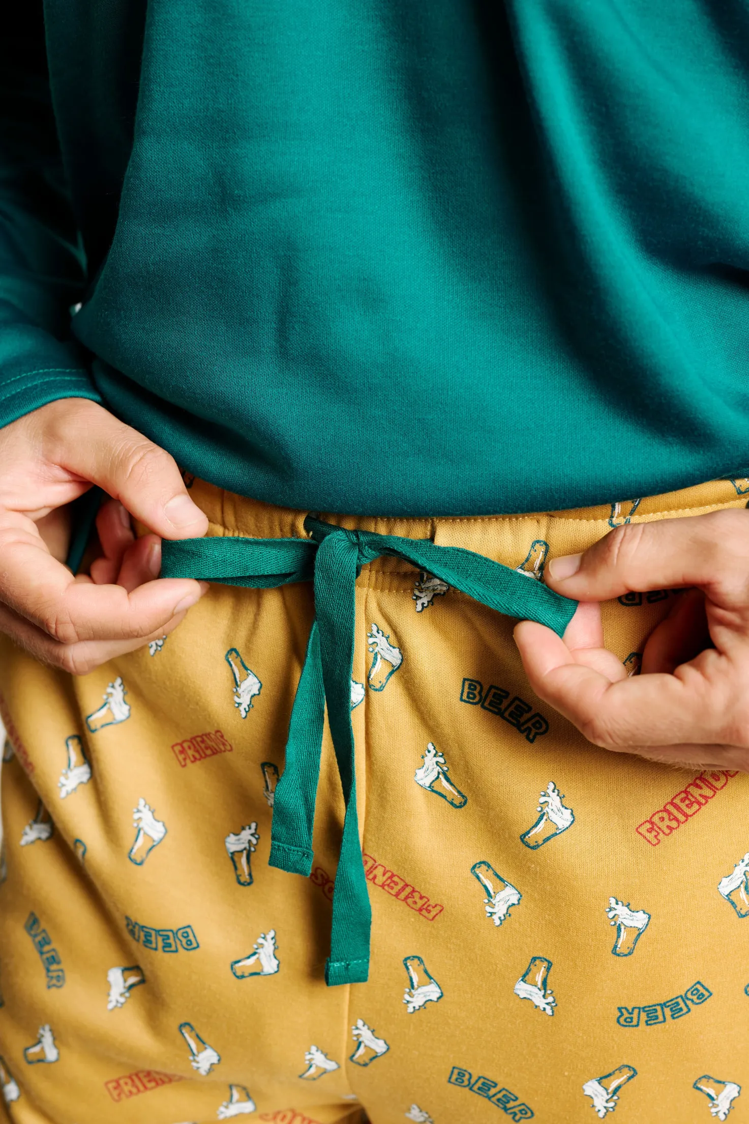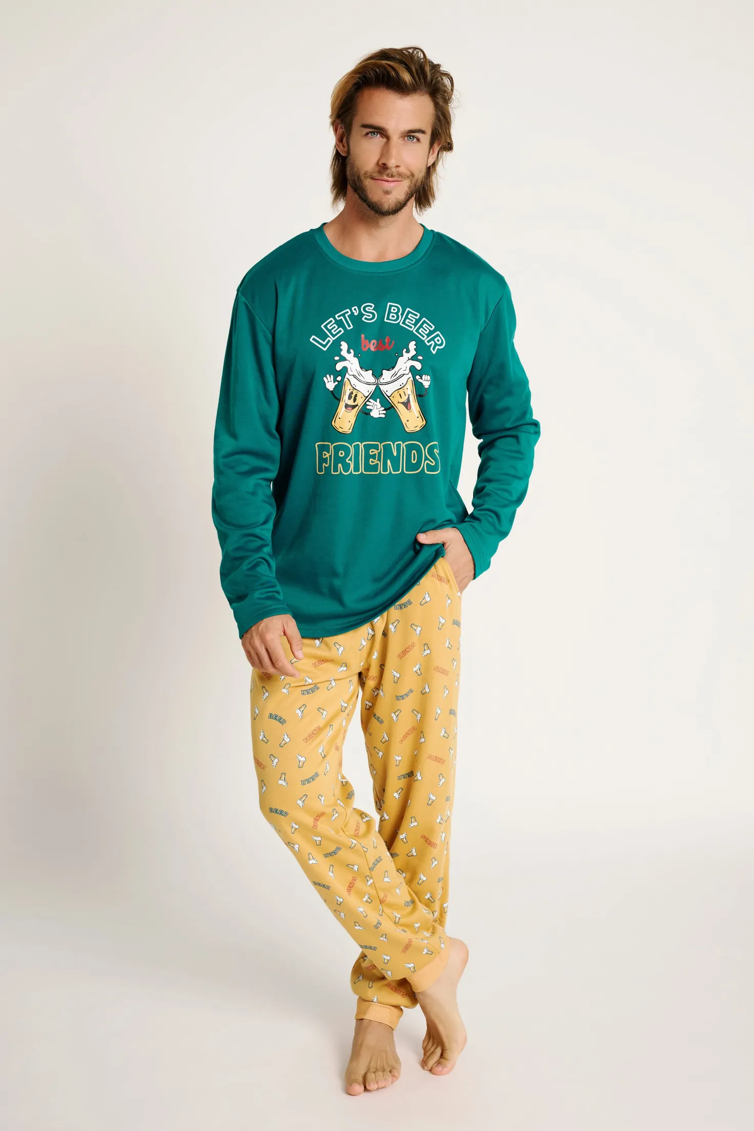 Este pijama largo para hombre combina diversión y confort. La camiseta verde presenta un estampado central con dos botellas brindando y el mensaje “Let’s beer friends”. El pantalón mostaza, con simpáticos dibujos de cerveza, incorpora un práctico bolsillo y cordón ajustable en la cintura para un ajuste cómodo y funcional. Ideal para relajarse en casa con estilo y comodidad.