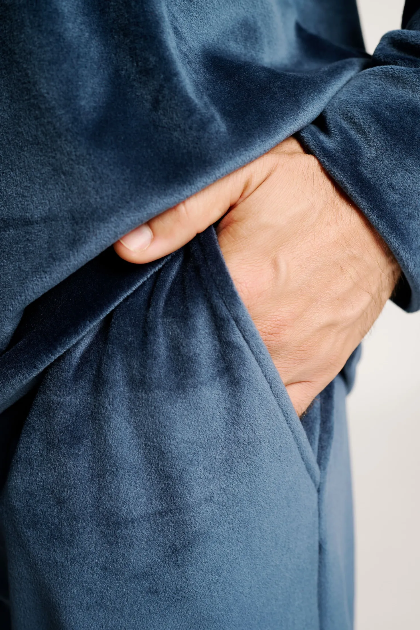 Este pijama largo para hombre combina estilo y confort gracias a su tejido ultrasuave de efecto terciopelo. La camiseta, en azul profundo, luce el mensaje “Regret nothing” en el pecho, con un diseño moderno y actitud positiva. El pantalón a juego cuenta con bolsillos laterales. Su textura afelpada y cálida convierte este conjunto en una opción perfecta para las noches de invierno.