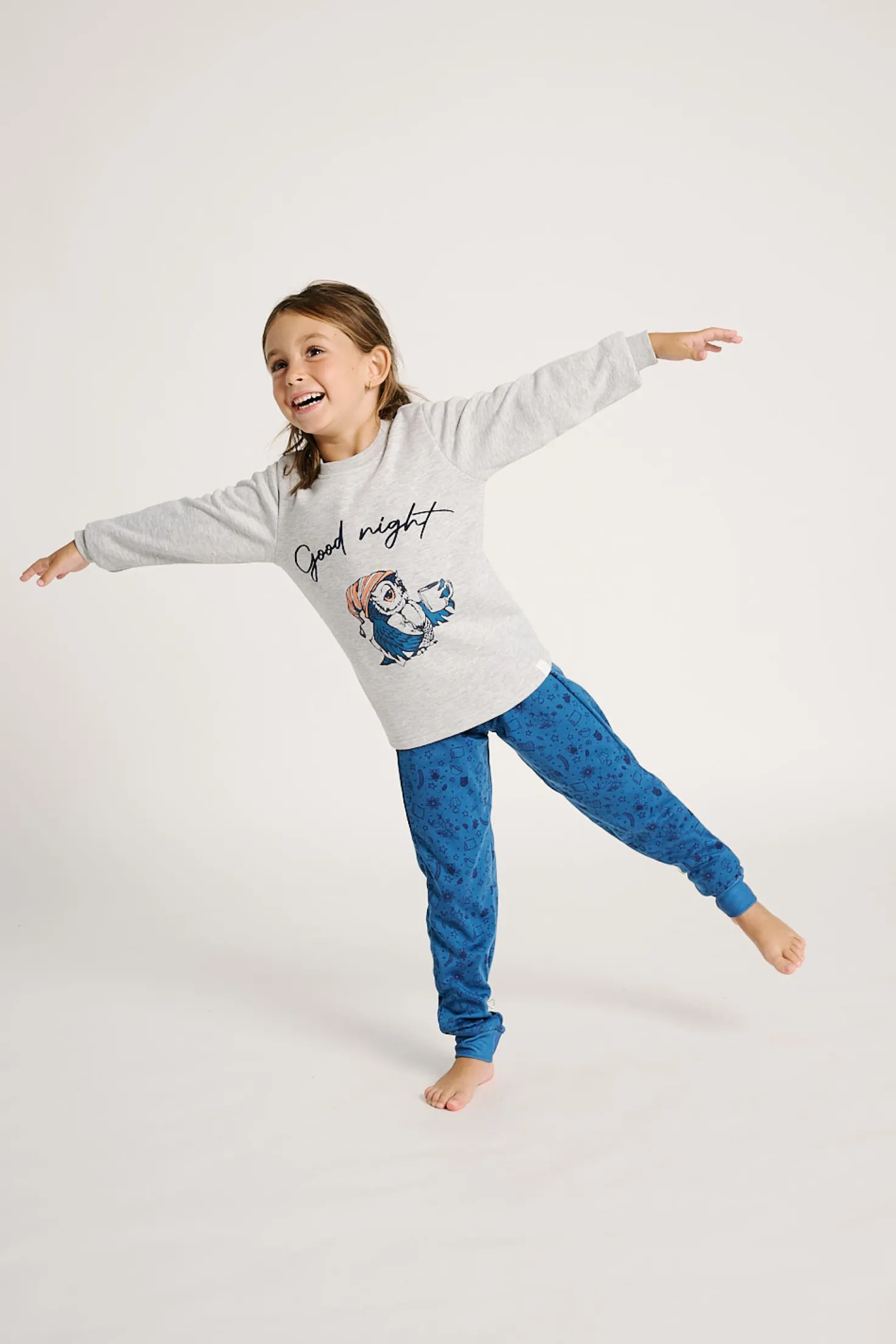 Pijama infantil de manga larga. Camiseta gris con ilustración de búho y texto “Good night” en tono azul, combinada con pantalón azul de estampado discreto y cinturilla elástica para un ajuste cómodo. Ideal para noches de descanso con calidez y estilo.
