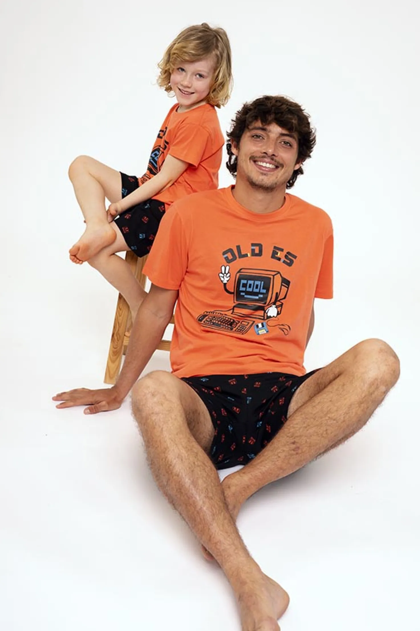 Conjunto de pijama de verano compuesto por camiseta de manga corta y pantalón corto. Confeccionado con algodón. Tejido ligero, fresco y transpirable. Camiseta gráfica con fondo naranja. Pantalón corto estampado con goma que se adapta a la cintura. Estampado de inspiración retro 90s. Modelo también disponible para adulto.