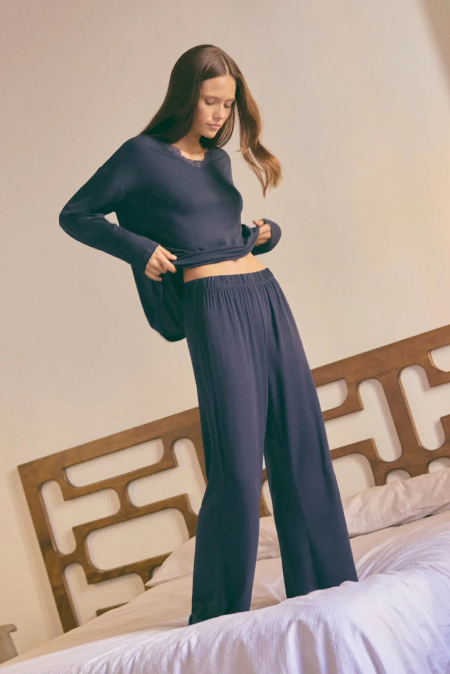 Descubre la elegancia del descanso con nuestro pijama largo de modal ultra suave, diseñado para envolver tu piel en una caricia de confort. Este conjunto de camiseta de manga larga con escote en pico y delicados detalles de encaje se combina con un pantalón ancho fluido, creando un look sofisticado y relajado para tus noches.