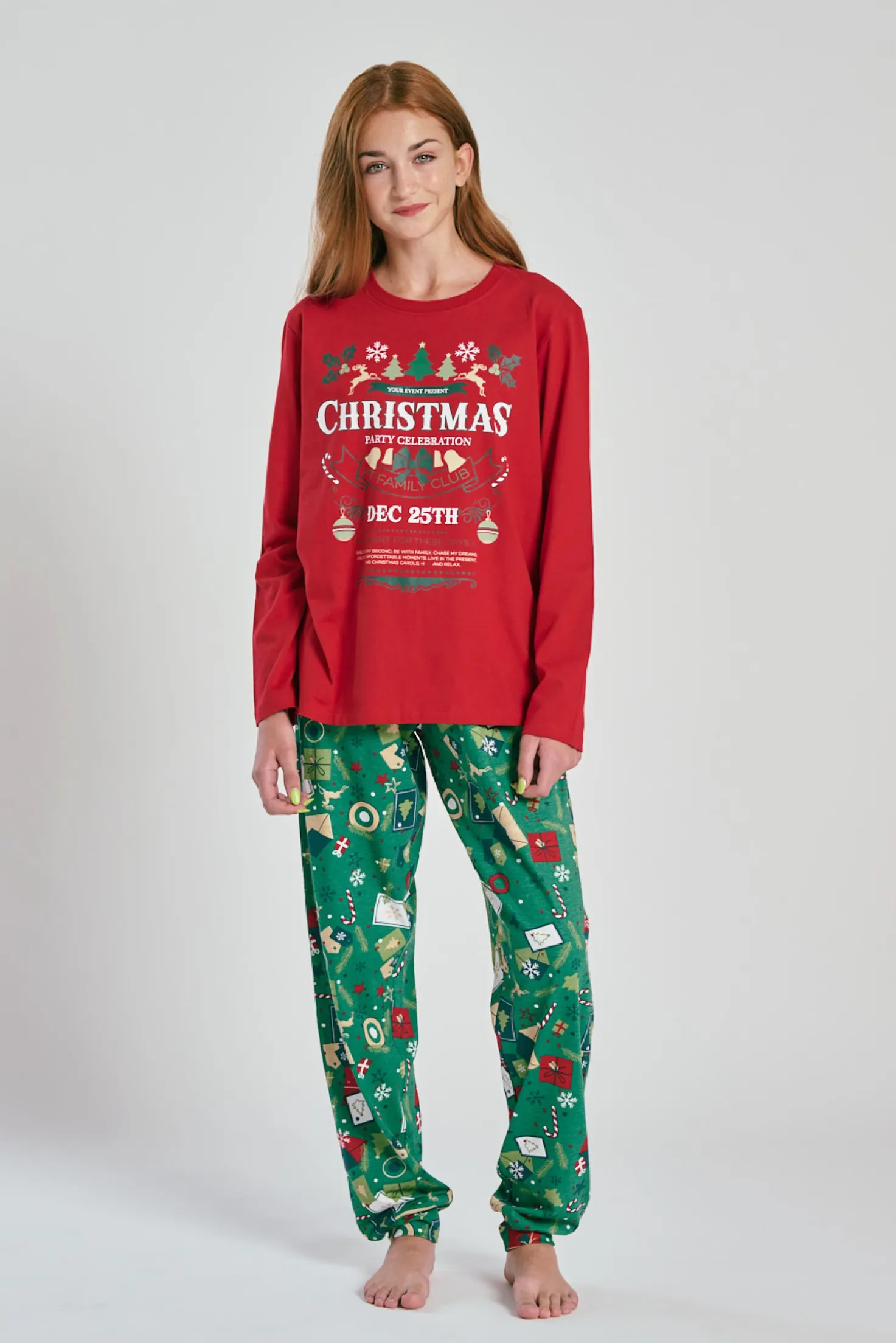 Pijama largo de dos piezas ideal para celebrar la Navidad con estilo y comodidad. La camiseta de manga larga, en vibrante color rojo, luce un alegre estampado frontal con el texto Christmas Party Celebration, acompañado de motivos navideños. El pantalón largo, en color verde, está decorado con un divertido estampado de sobres, copos de nieve, bastones de caramelo y otros elementos festivos. Confeccionado en tejido suave y agradable al tacto, es perfecto para disfrutar de las noches de invierno y vivir el espíritu navideño en casa.