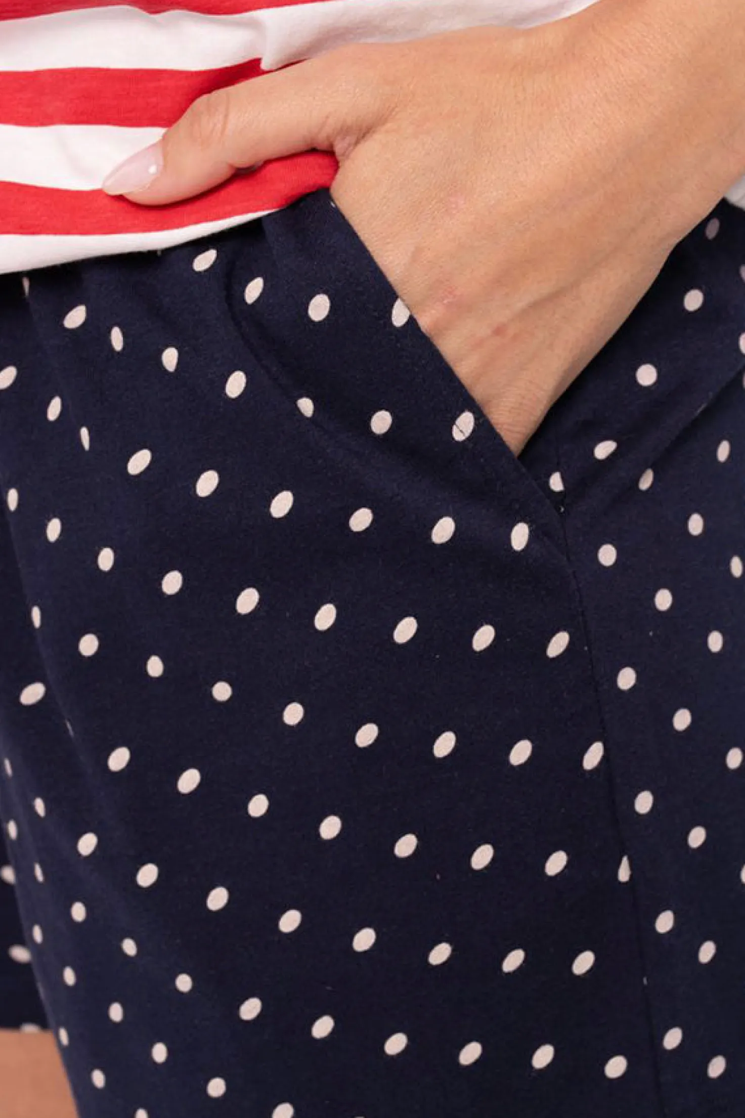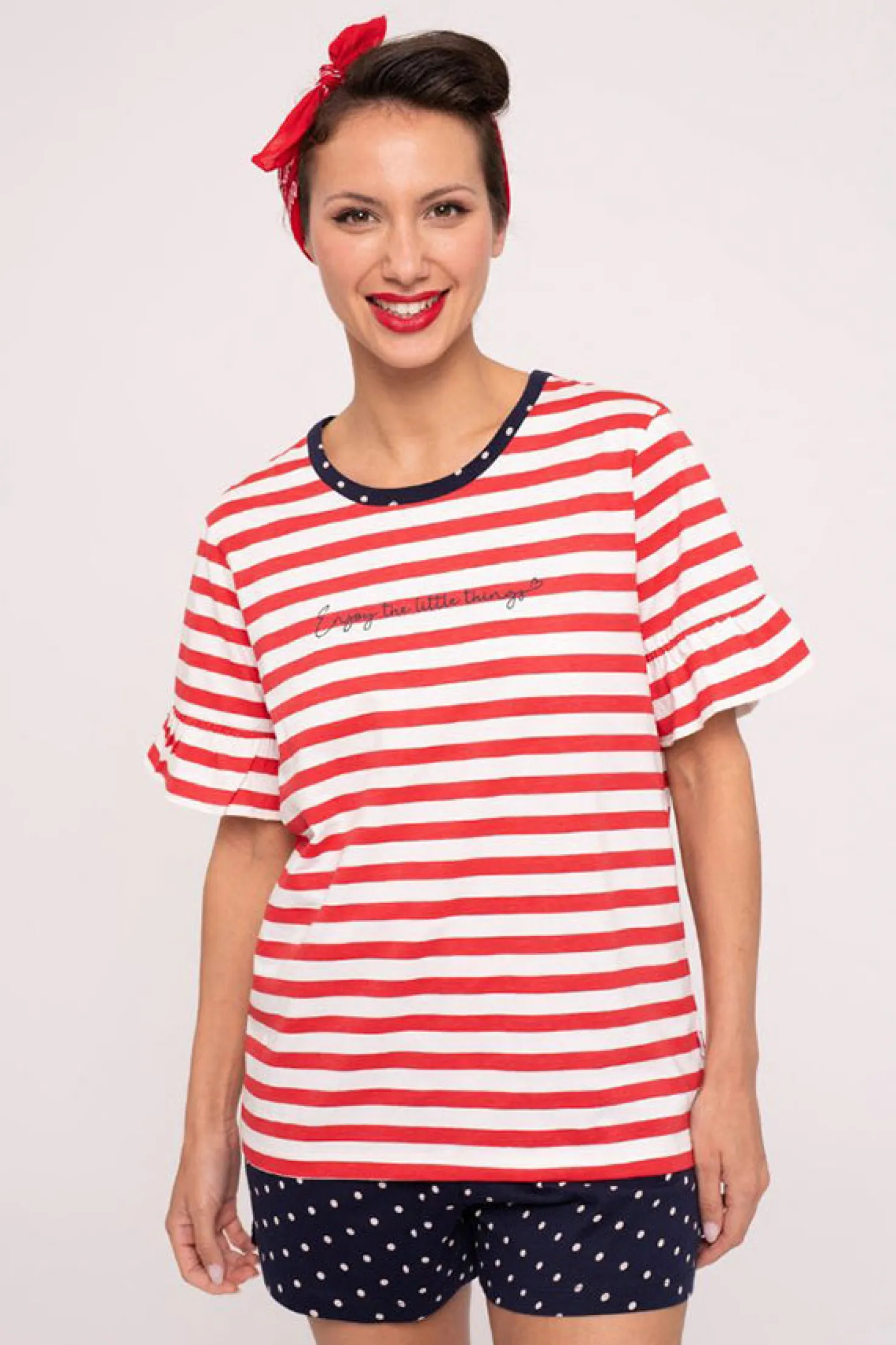 Conjunto de pijama con camiseta de manga corta de rayas rojas y pantalones cortos marinos con lunares blancos. La camiseta tiene volantes en las mangas, y los pantalones incluyen bolsillos integrados y cordones ajustables.