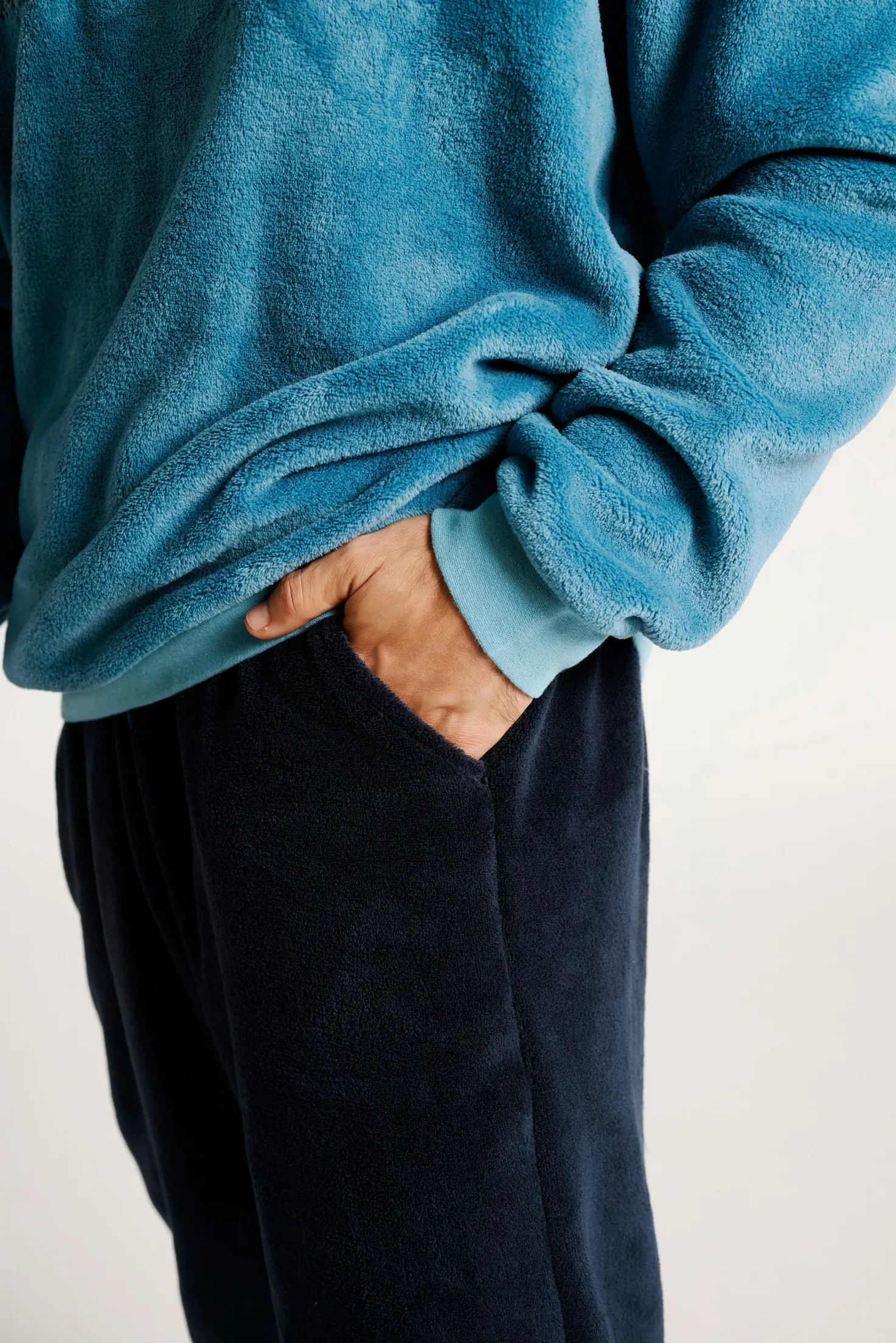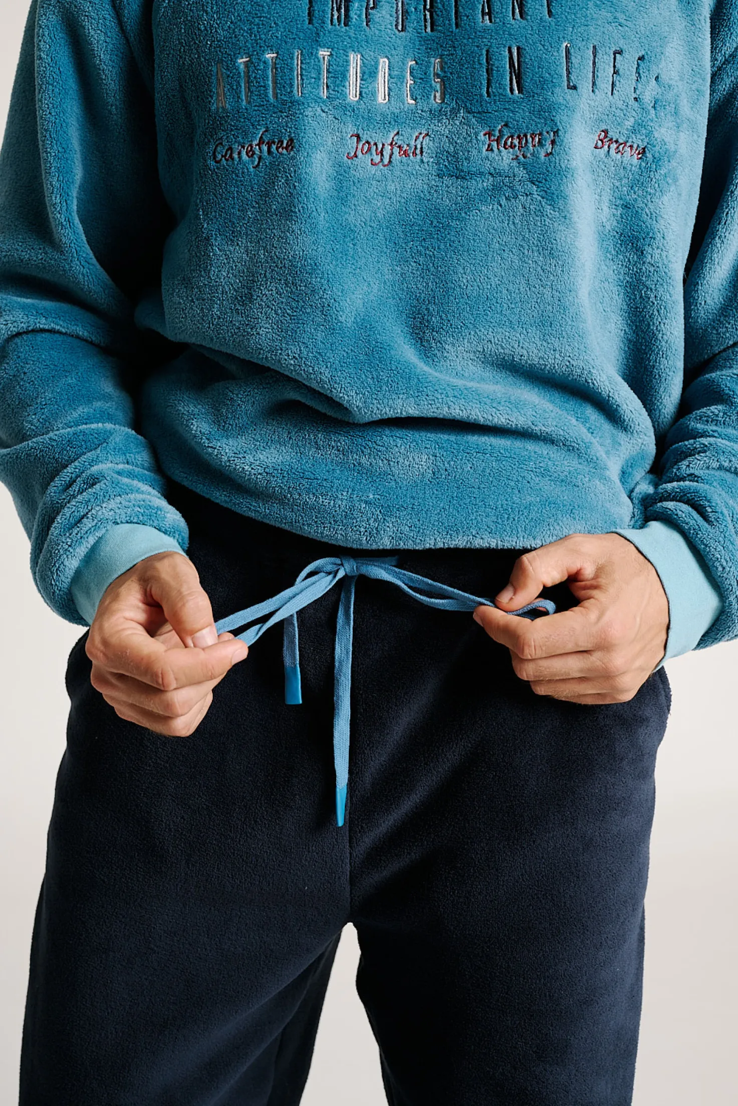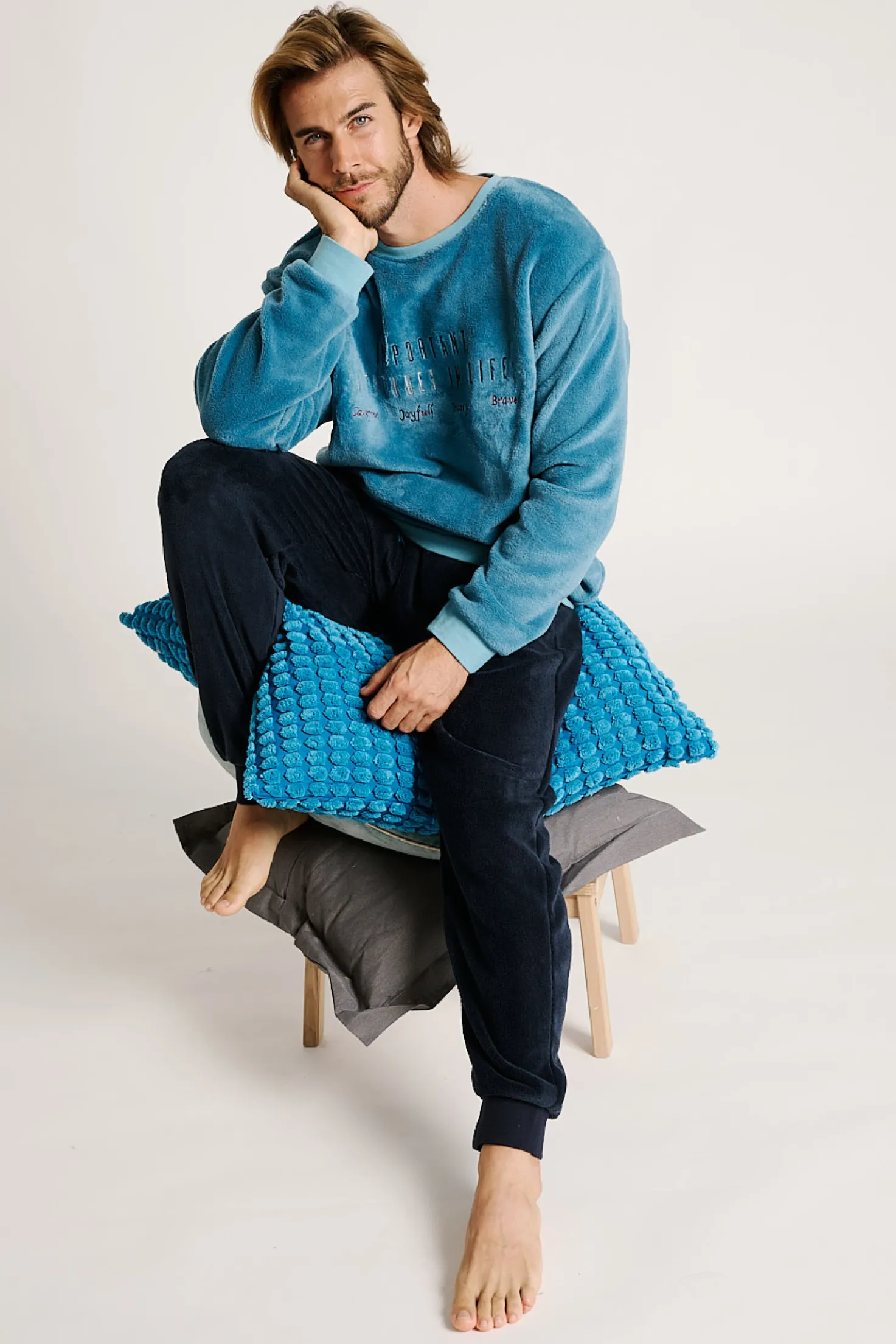 Este pijama largo de hombre es una opción cálida y estilosa para los días más fríos. Con un diseño en tejido efecto terciopelo, combina una parte superior azul con mensaje bordado en el pecho y un pantalón oscuro con bolsillos laterales. Un conjunto cómodo y moderno para descansar sin renunciar al estilo.