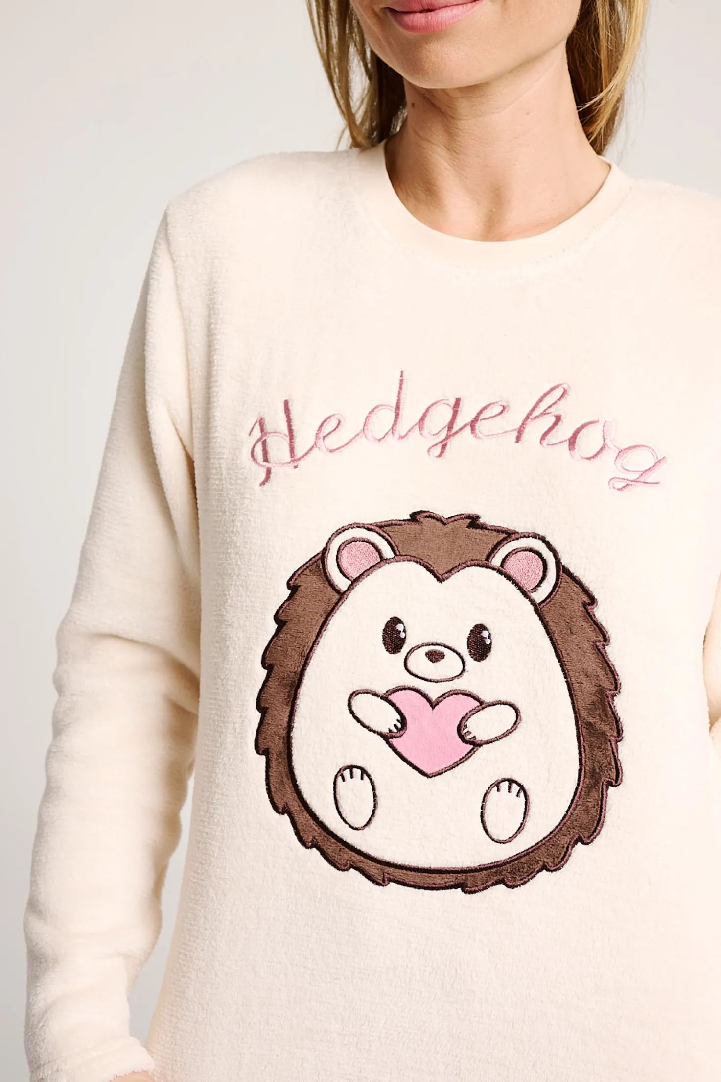 Este pijama de invierno combina la suavidad del tejido polar con un diseño entrañable. La parte superior, en color crema, destaca por el estampado frontal de un simpático erizo con corazón, mientras que el pantalón, en color burdeos, presenta un patrón de pequeños lunares blancos. Con puños en las mangas y tobillos, ofrece un ajuste cómodo que retiene el calor, ideal para las noches más frías.
