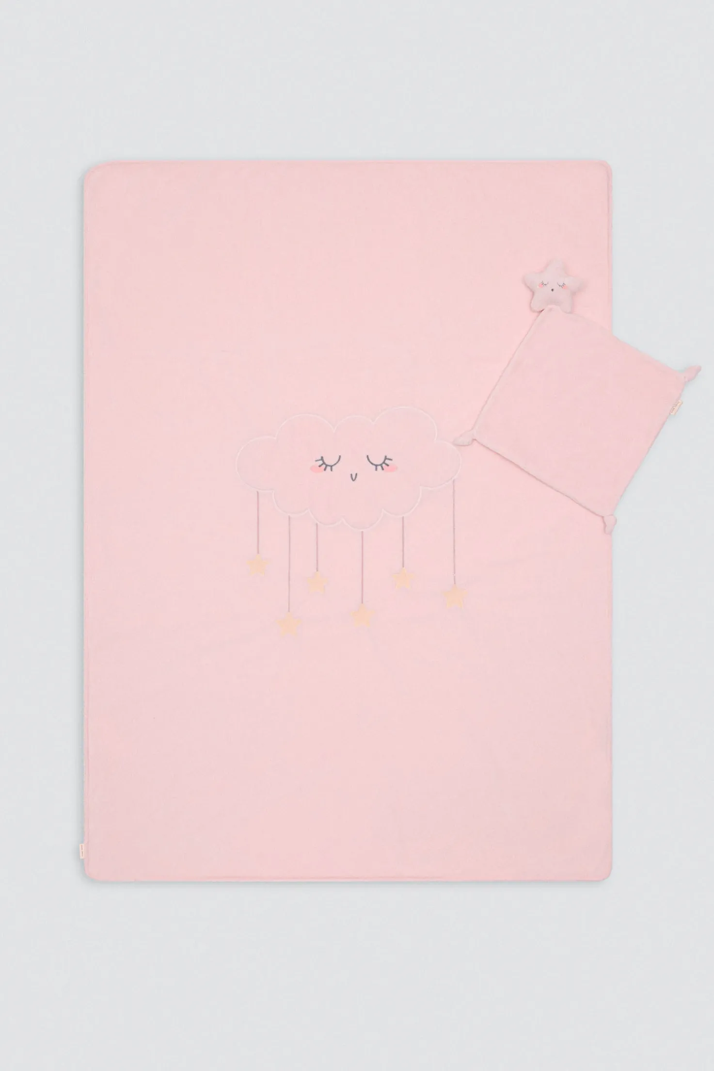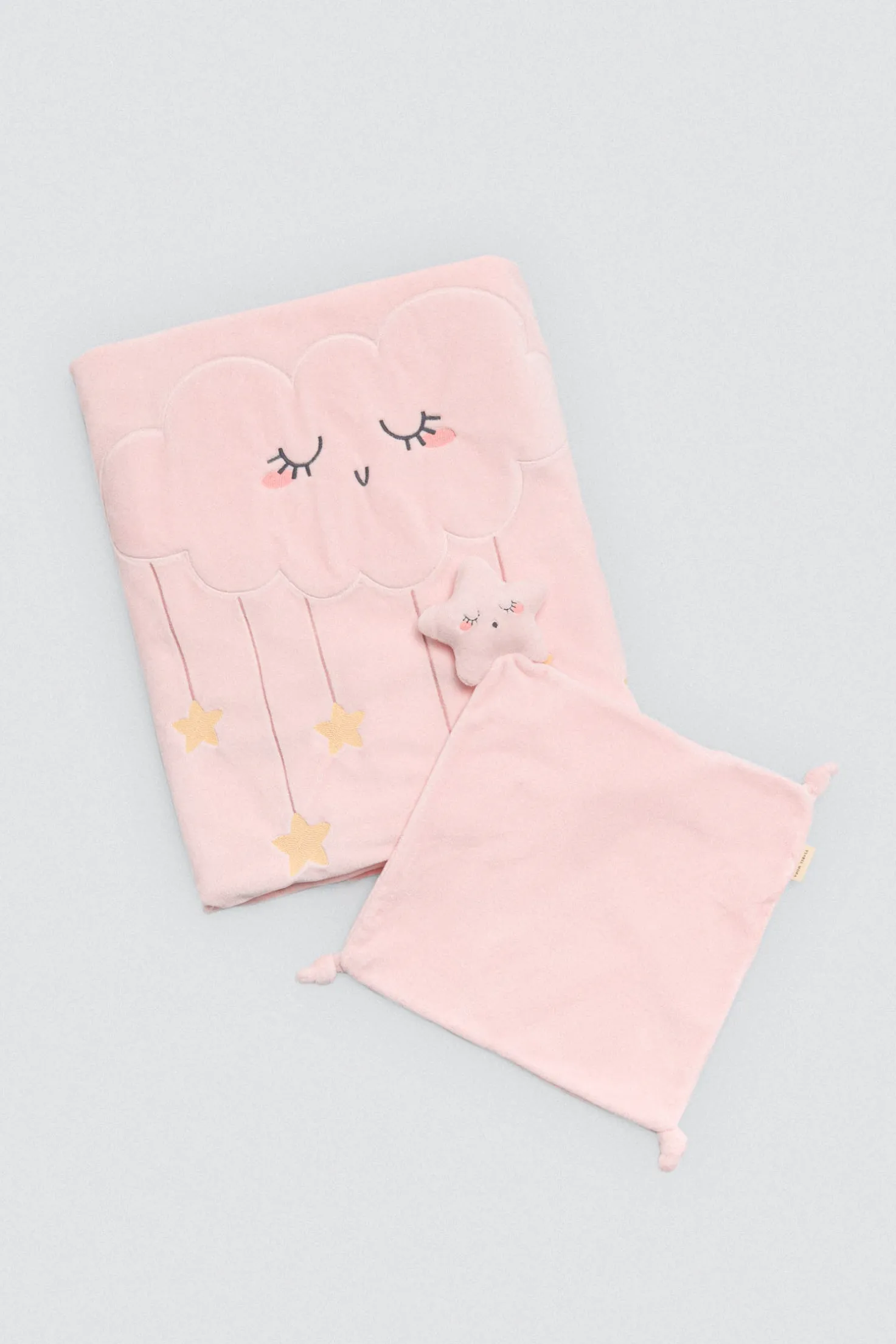 Pack de regalo para recién nacido: manta de tacto suave y doudou a juego en tono rosa con diseño de estrellitas. Aporta calidez y compañía desde los primeros días del bebé. Perfecto para canastilla o regalo especial.