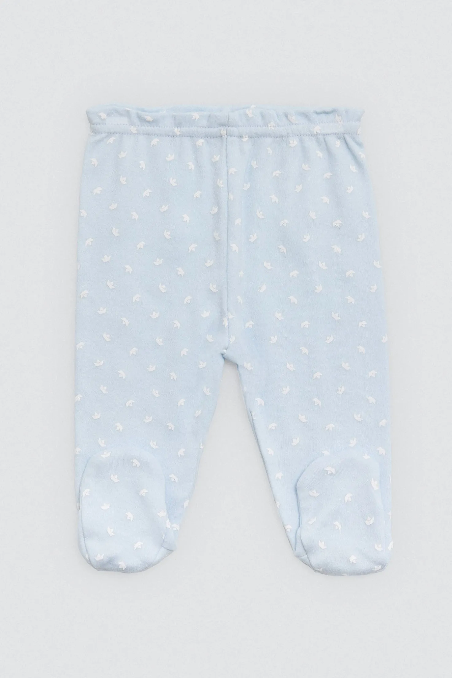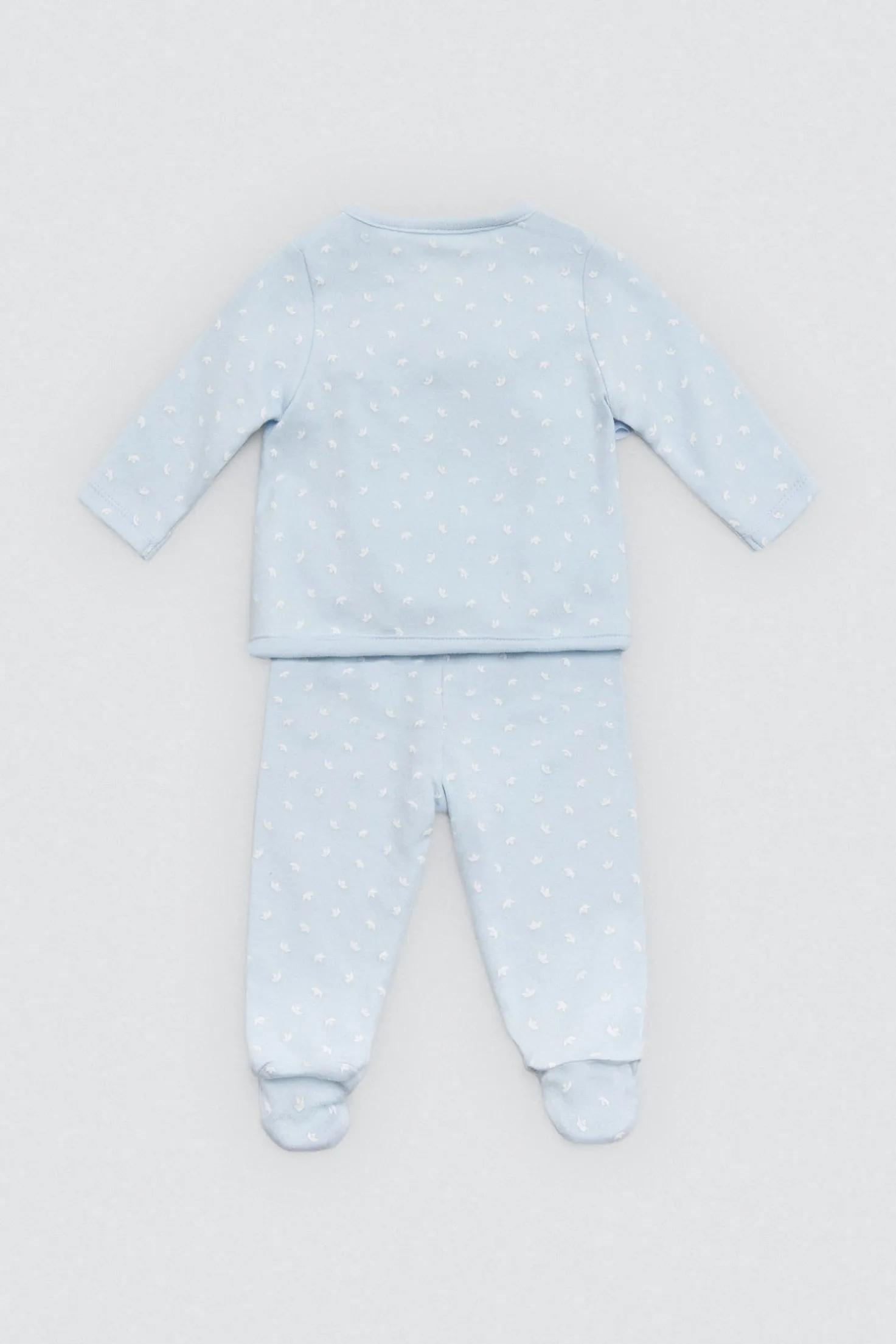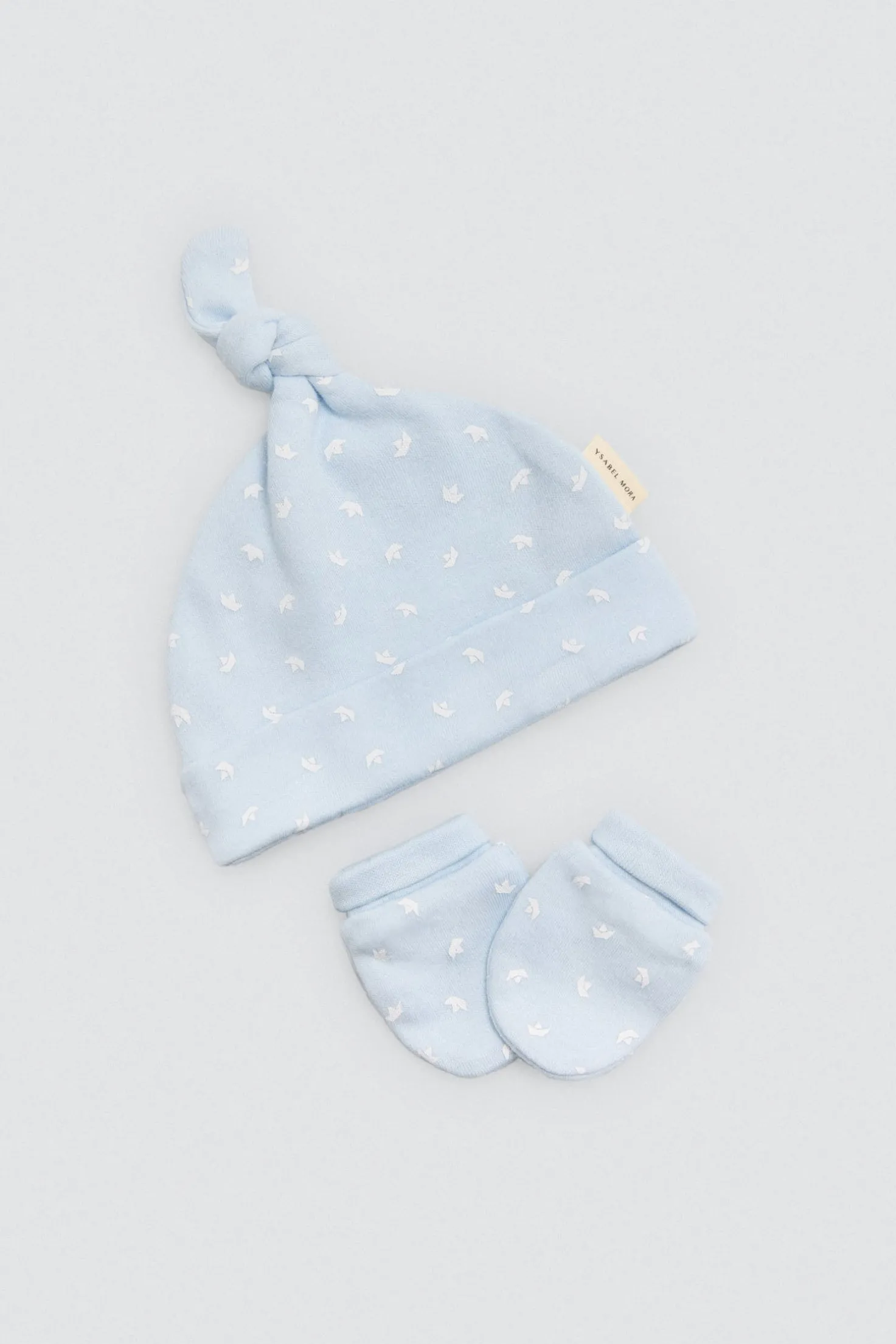 Conjunto completo para la primera puesta del bebé niño. Compuesto por 4 piezas: camiseta cruzada, polaina, gorro con nudo y manoplas. Fabricado en algodón natural, ideal para los primeros días por su suavidad y calidez.