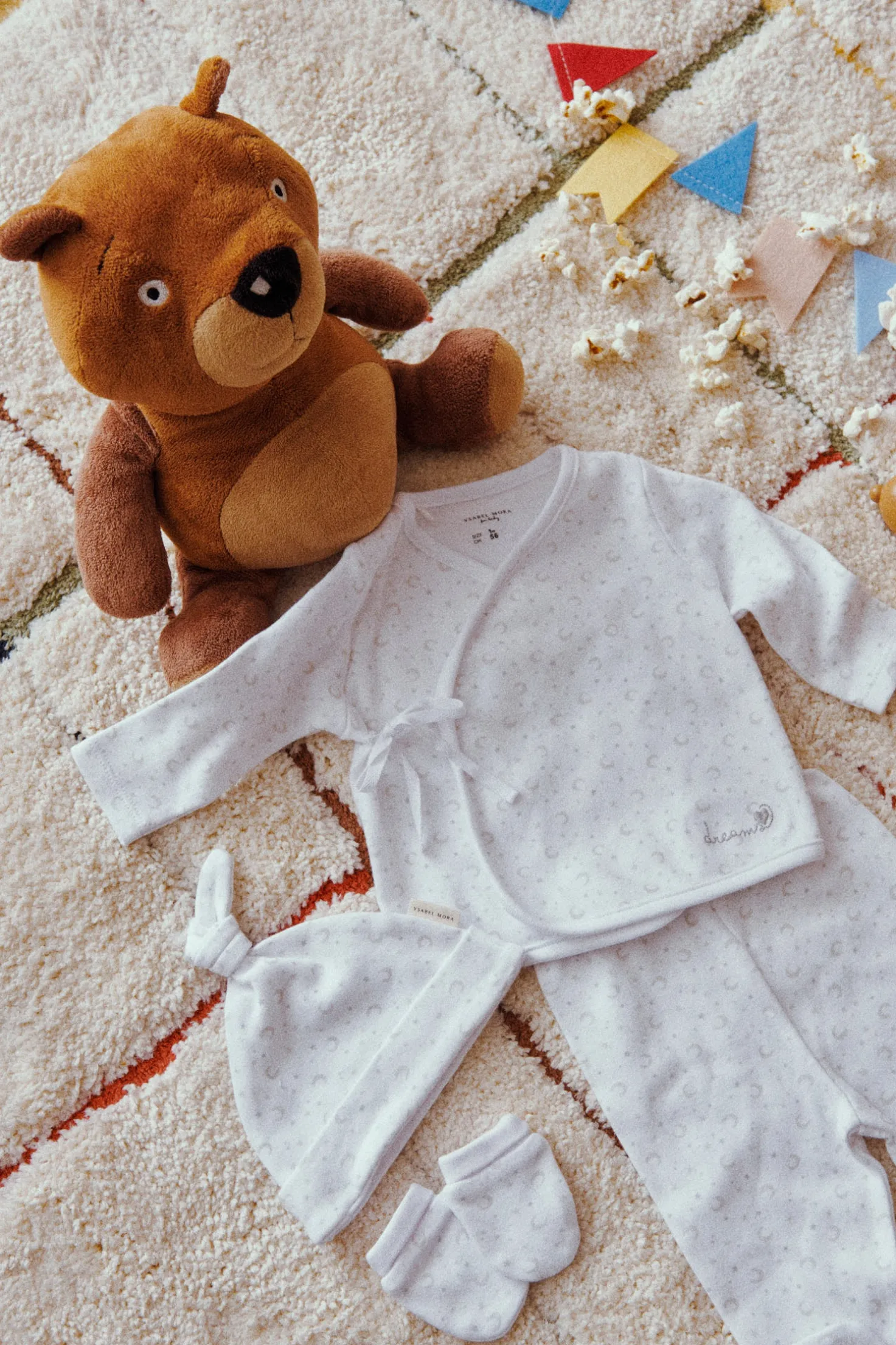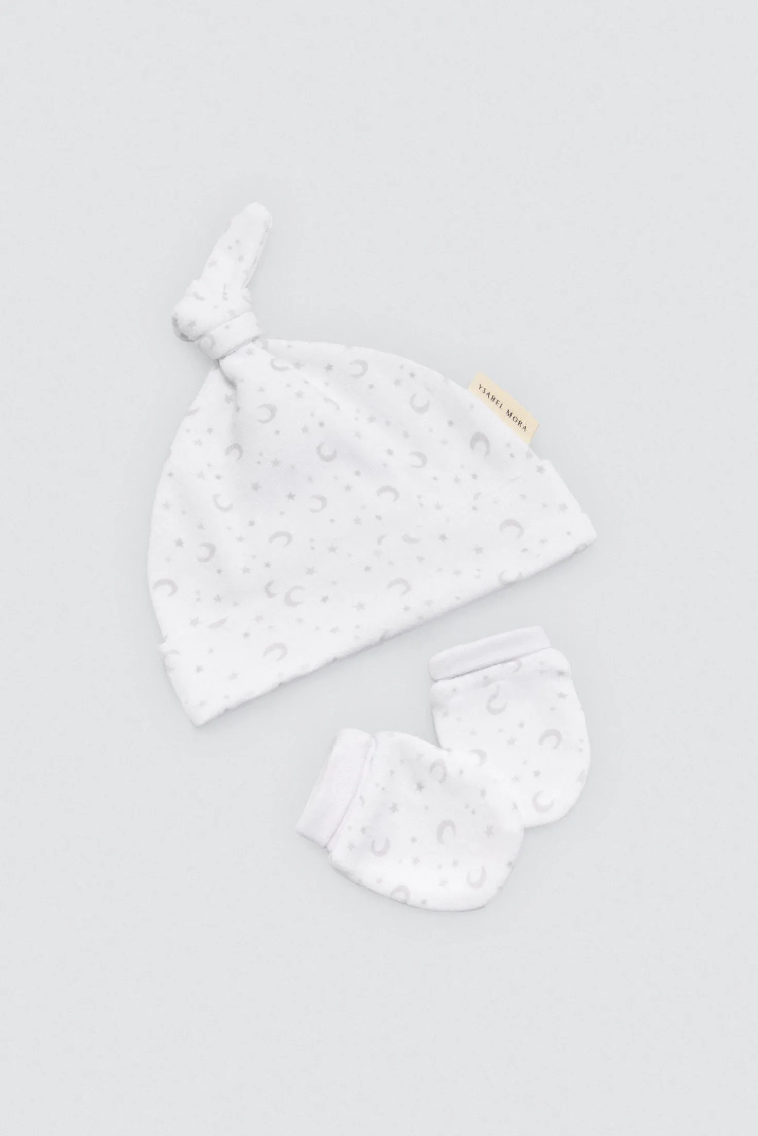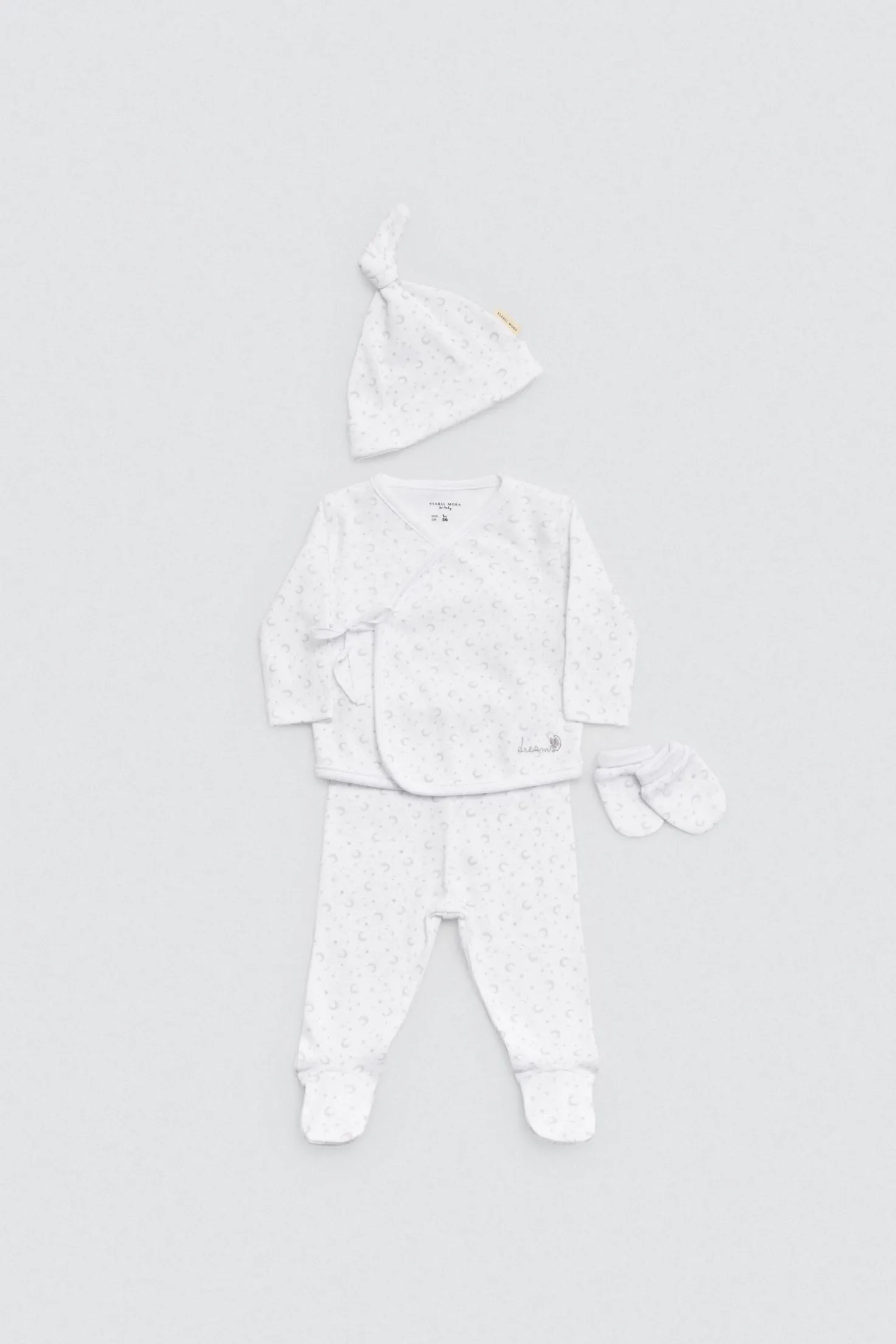 Pack unisex para recién nacido con camiseta cruzada de manga larga, polaina, gorro con nudo y manoplas. Confeccionado en algodón 100%, perfecto para los primeros días del bebé. Disponible en color blanco neutro.