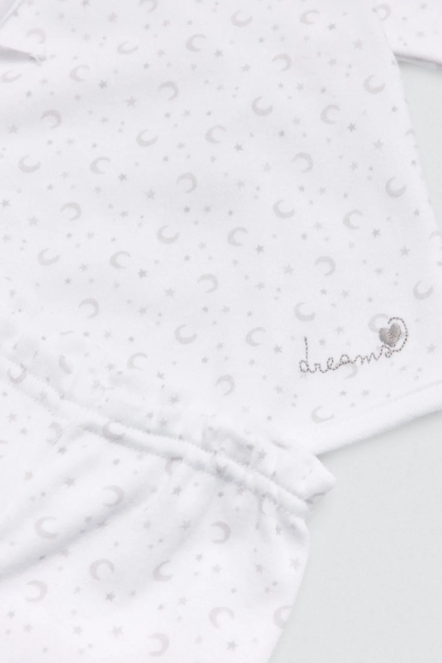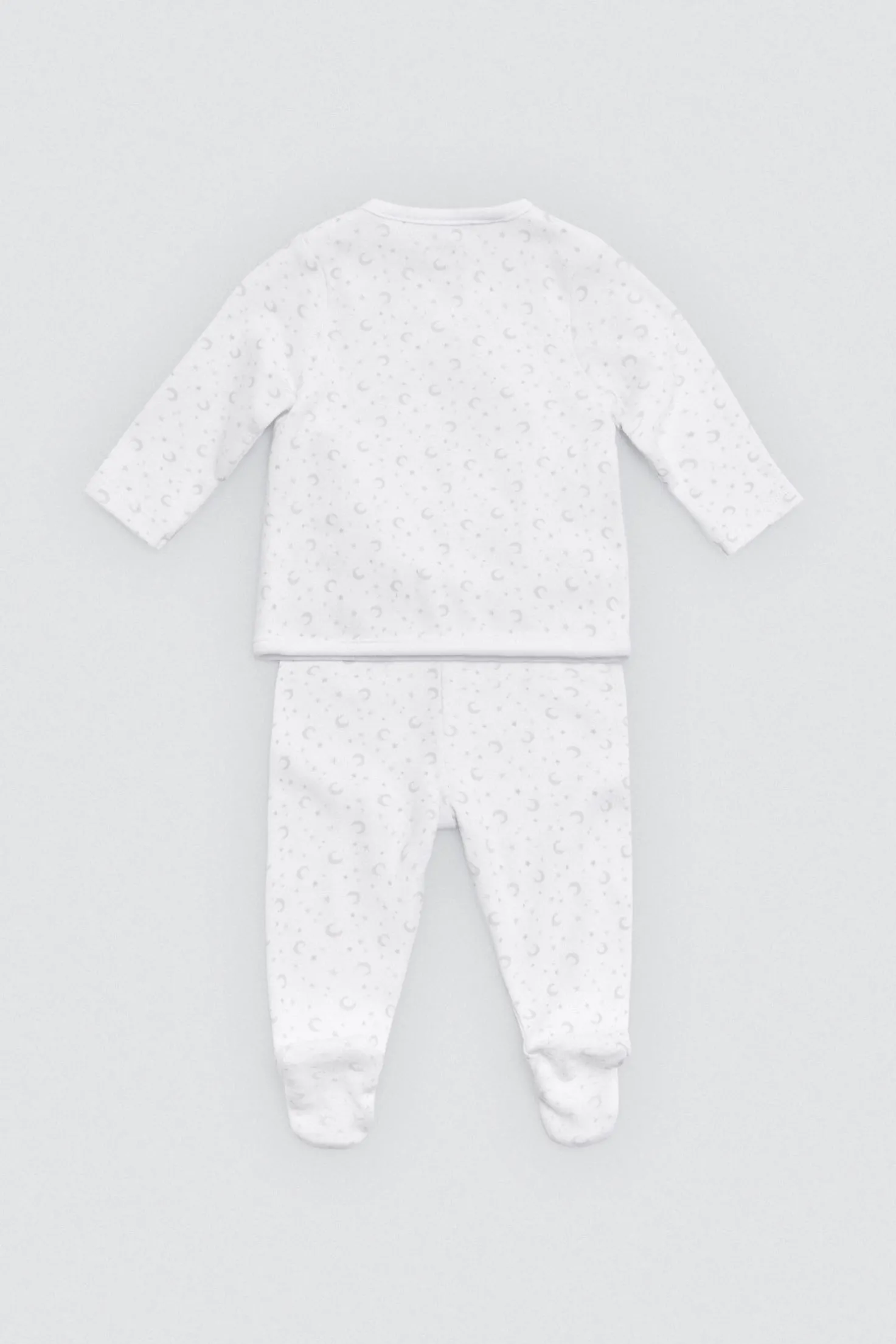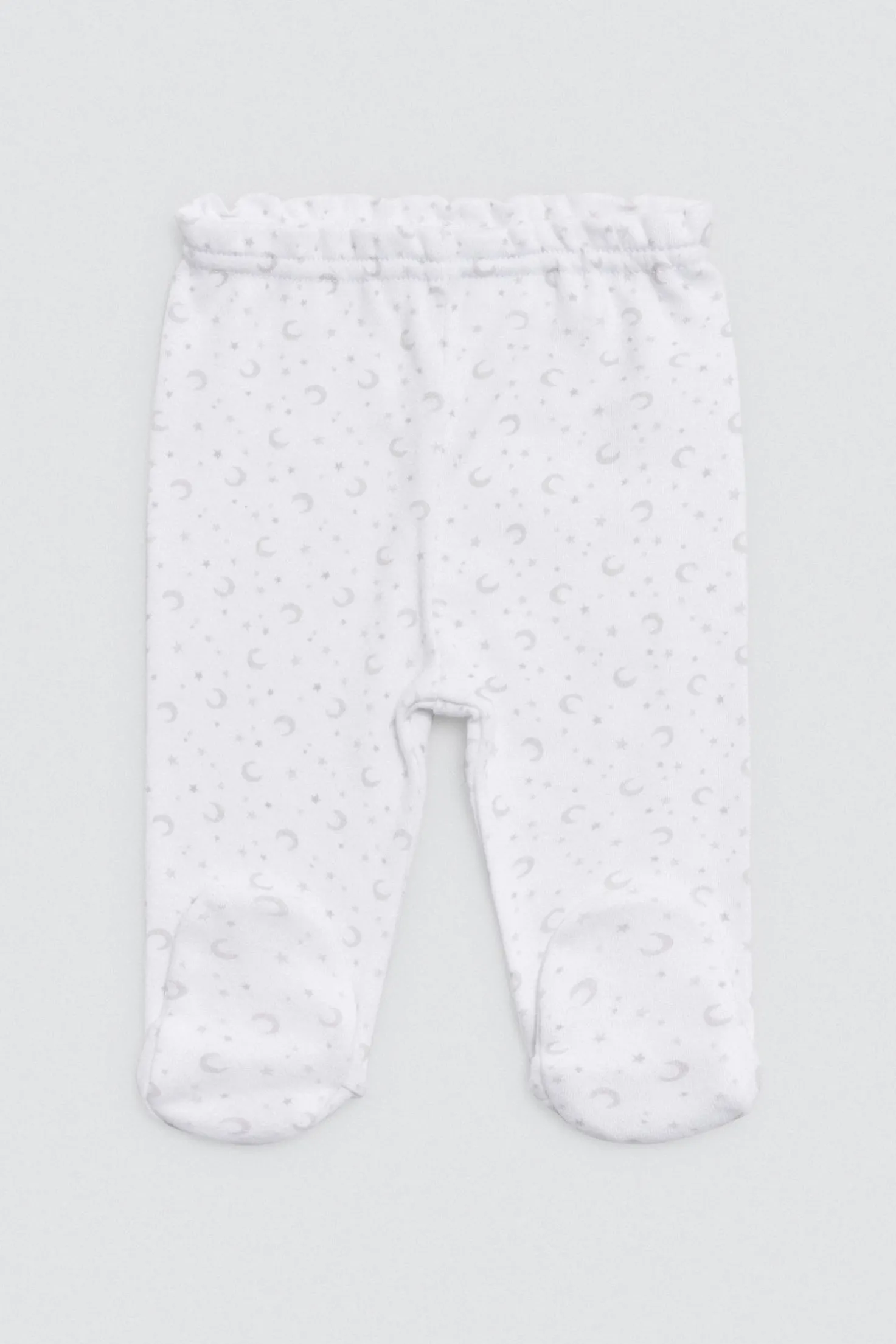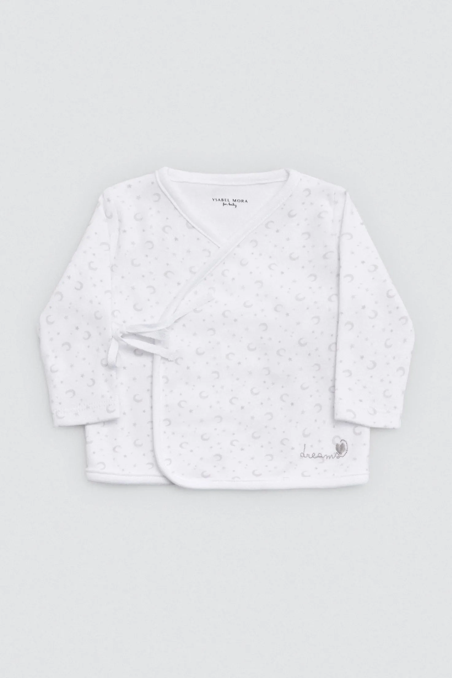 Pack unisex para recién nacido con camiseta cruzada de manga larga, polaina, gorro con nudo y manoplas. Confeccionado en algodón 100%, perfecto para los primeros días del bebé. Disponible en color blanco neutro.