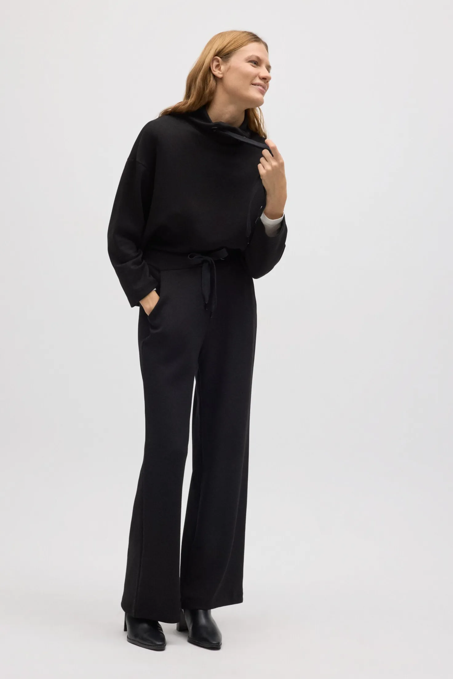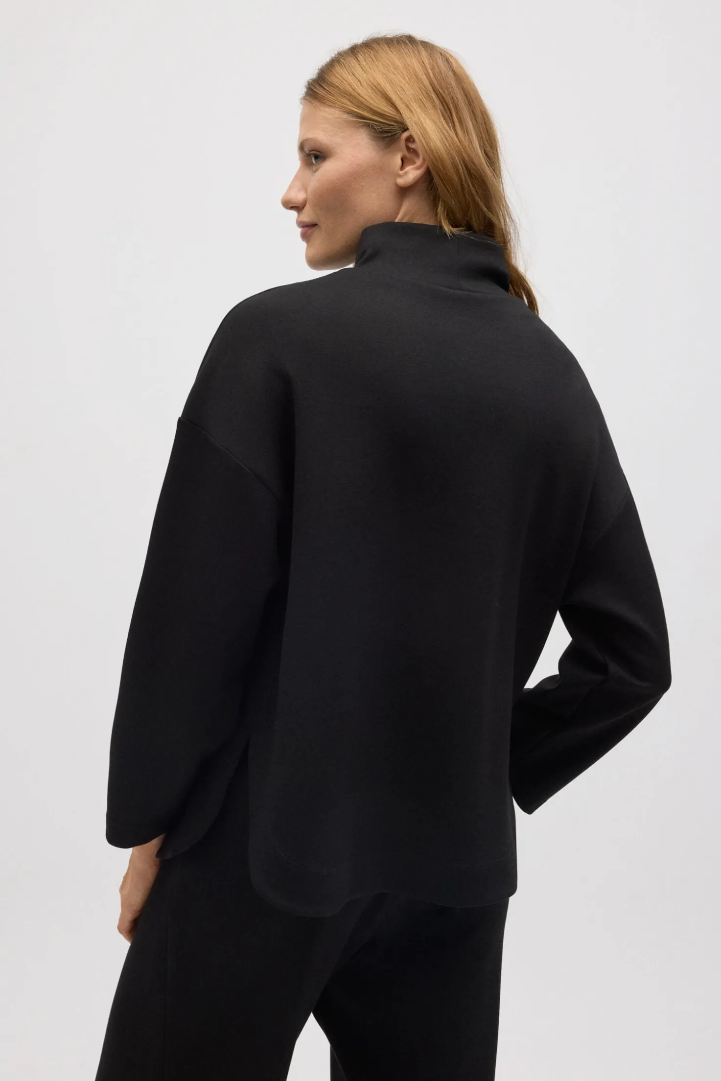 La suadera con cuello fluido es una prenda esencial para un estilo cómodo y sofisticado. El cuello fluido y el tejido ligero de esta sudadera la convierten en una opción perfecta para cualquier ocasión. Su diseño fluido la hace ideal para usar tanto en un look casual como elegante.