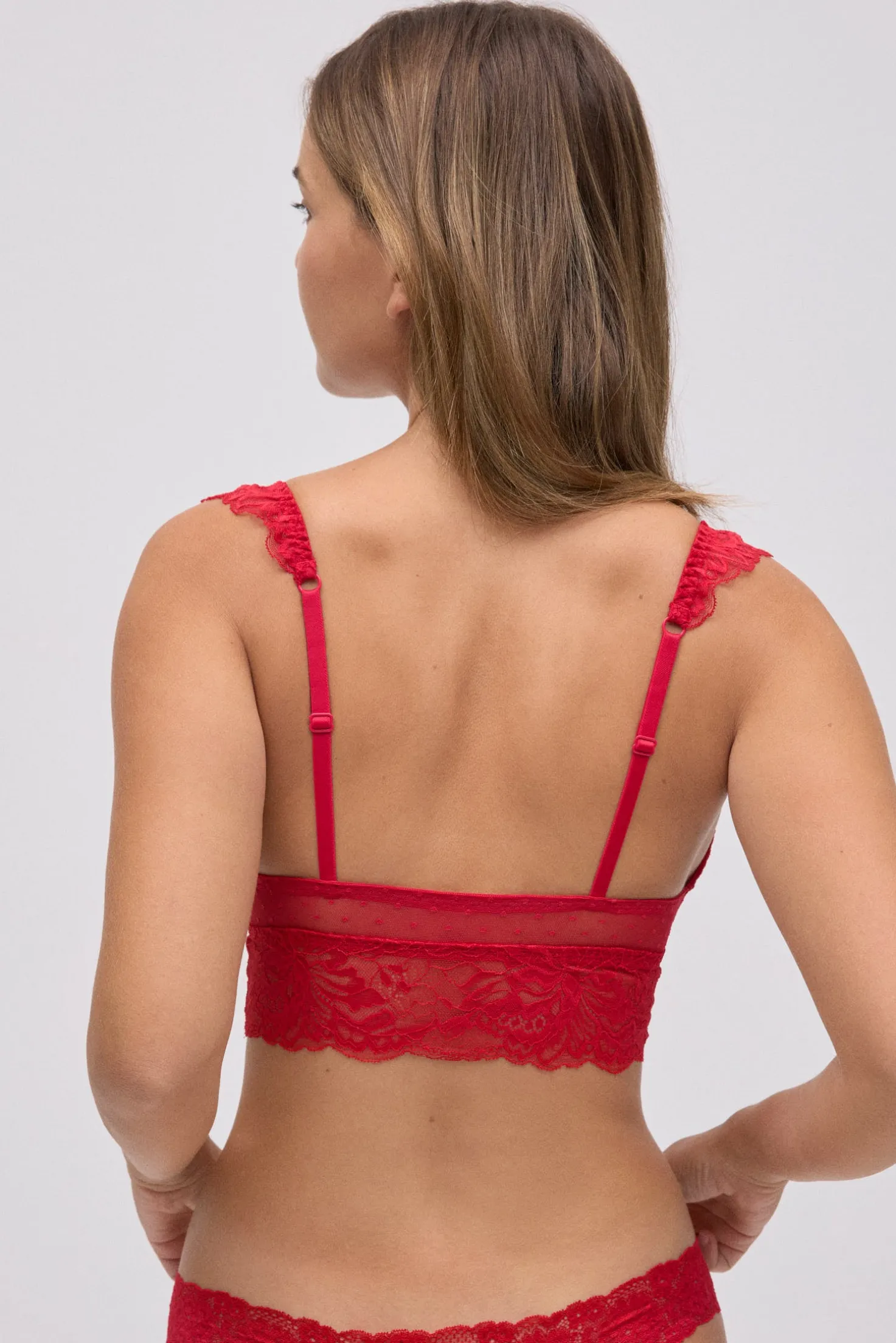 Este sujetador tipo bralette está diseñado para ofrecer una sensación ligera y natural sin renunciar a la feminidad. Confeccionado en encaje floral rojo, destaca por su diseño sin aros ni relleno, ideal para quienes priorizan la comodidad sin perder estilo. El detalle de la banda ancha de encaje bajo el pecho aporta sujeción suave y un acabado elegante y actual.