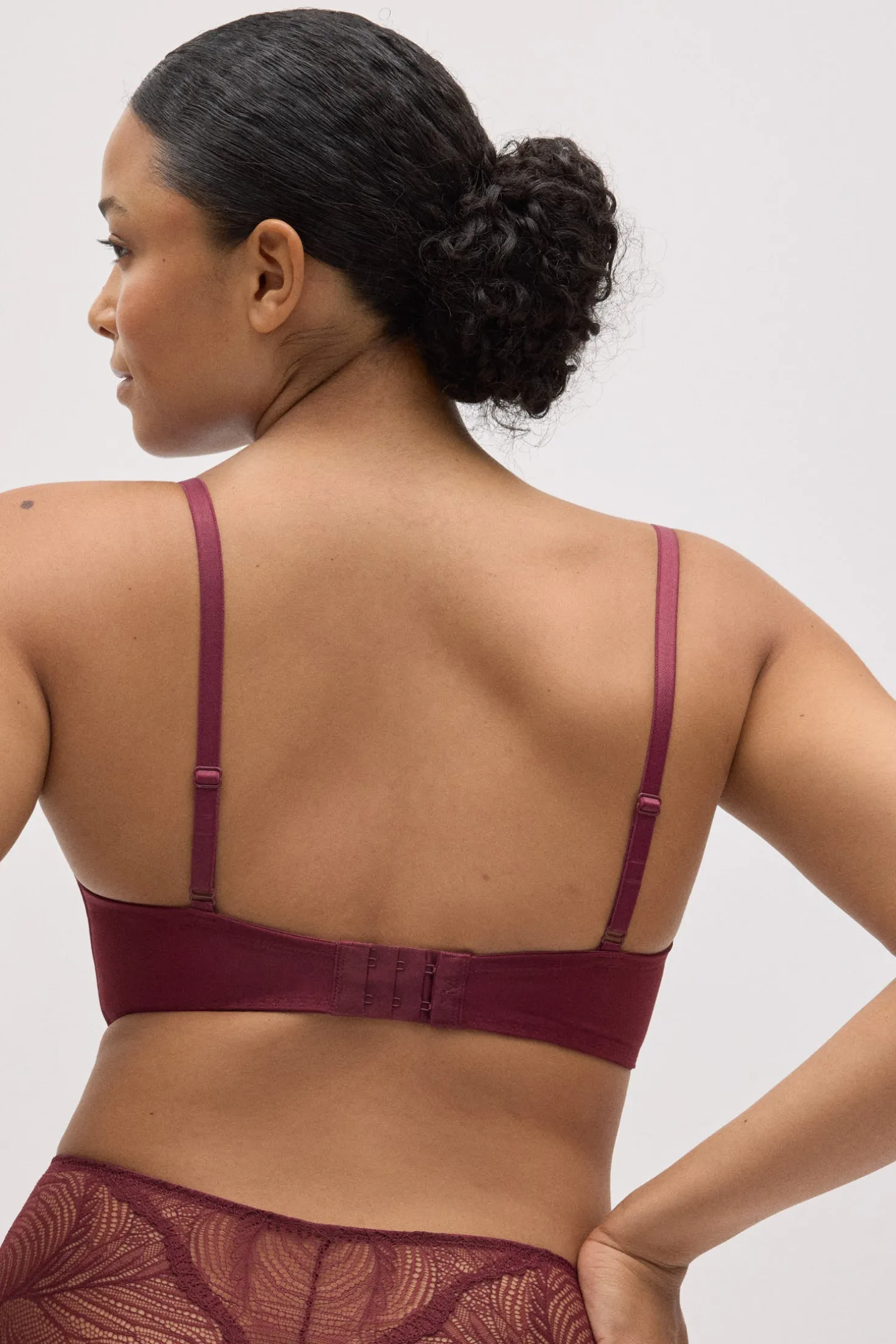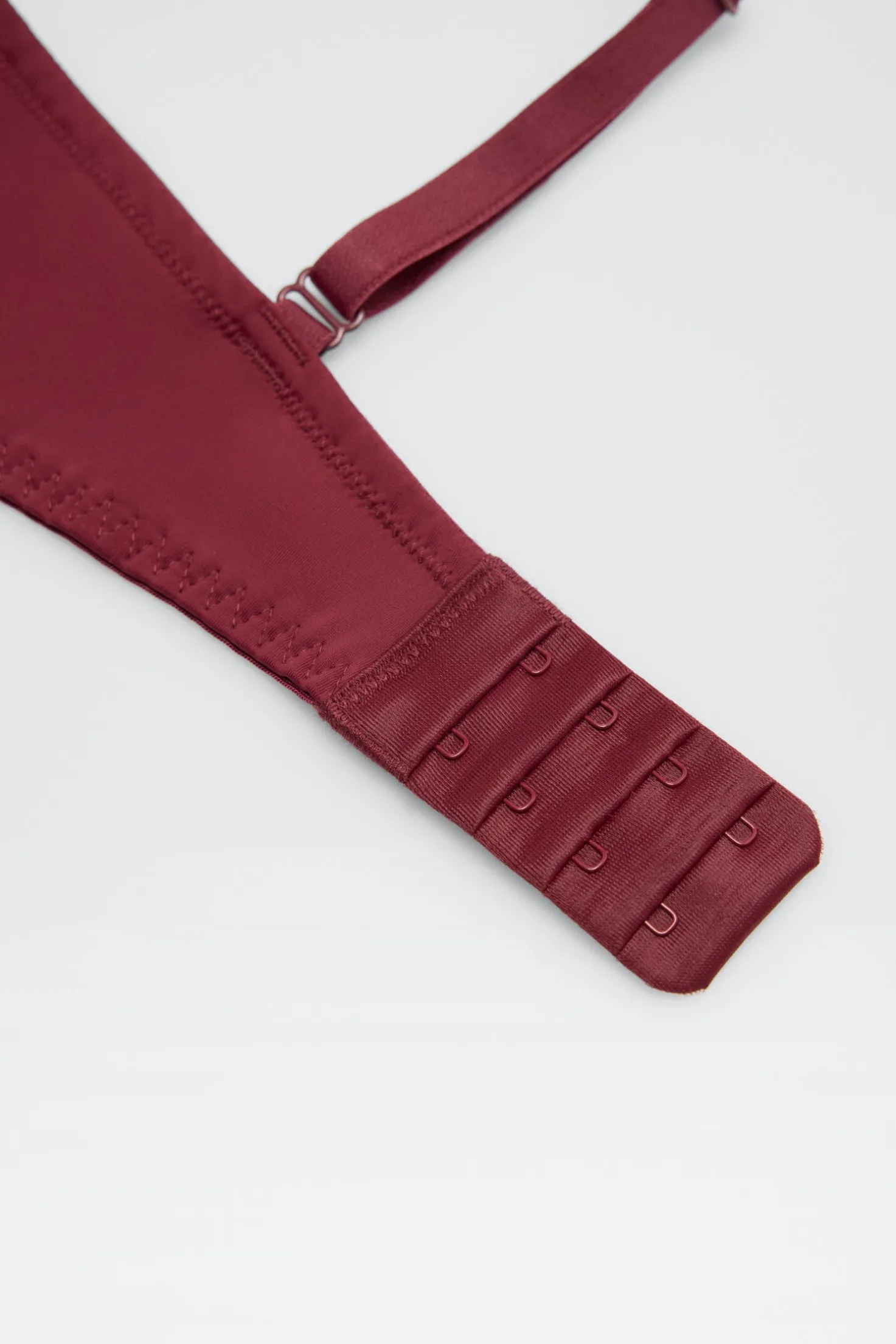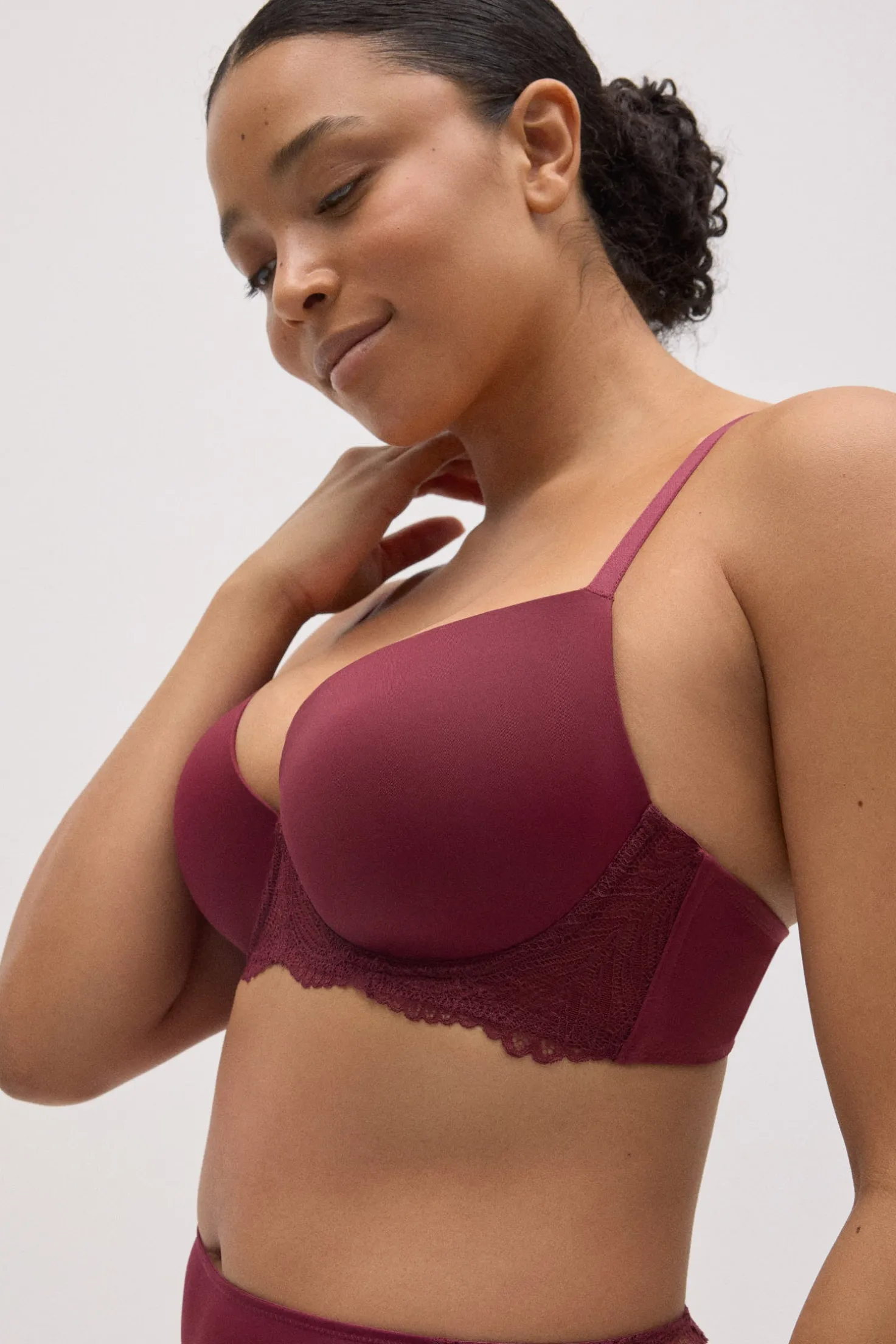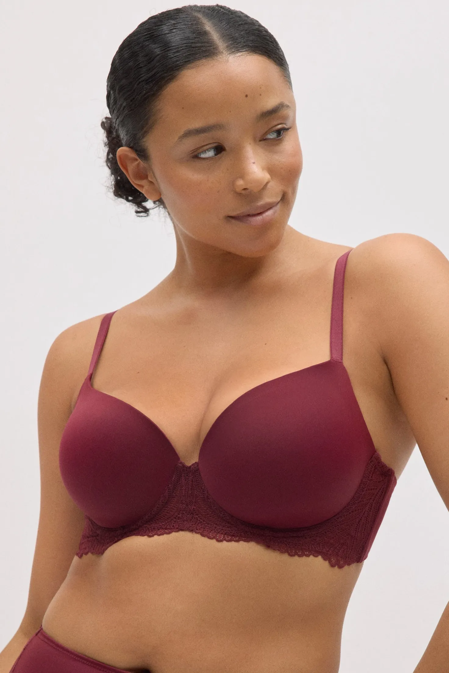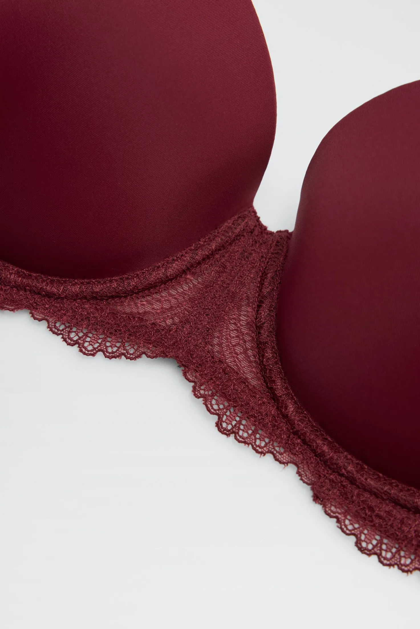 Sujetador con aro y relleno que combina un acabado liso en las copas con un delicado detalle de encaje en el contorno. Su diseño en color granate ofrece un estilo elegante y muy favorecedor, perfecto para el día a día o para completar un conjunto de lencería especial.