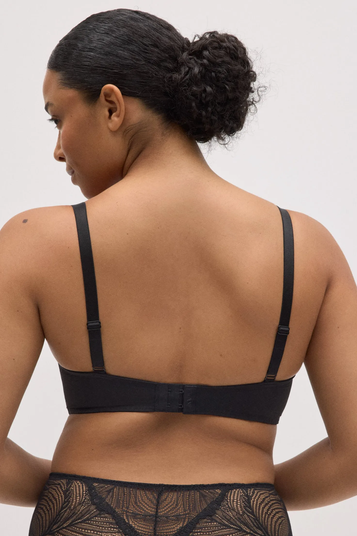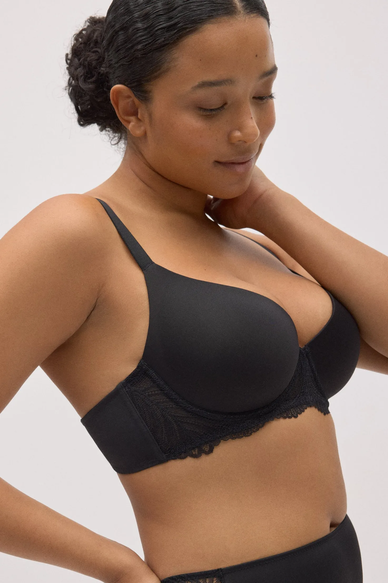 Sujetador con aro y relleno que combina un acabado liso en las copas con un delicado detalle de encaje en el contorno. Su diseño en color negro ofrece un estilo elegante y muy favorecedor, perfecto para el día a día o para completar un conjunto de lencería especial.