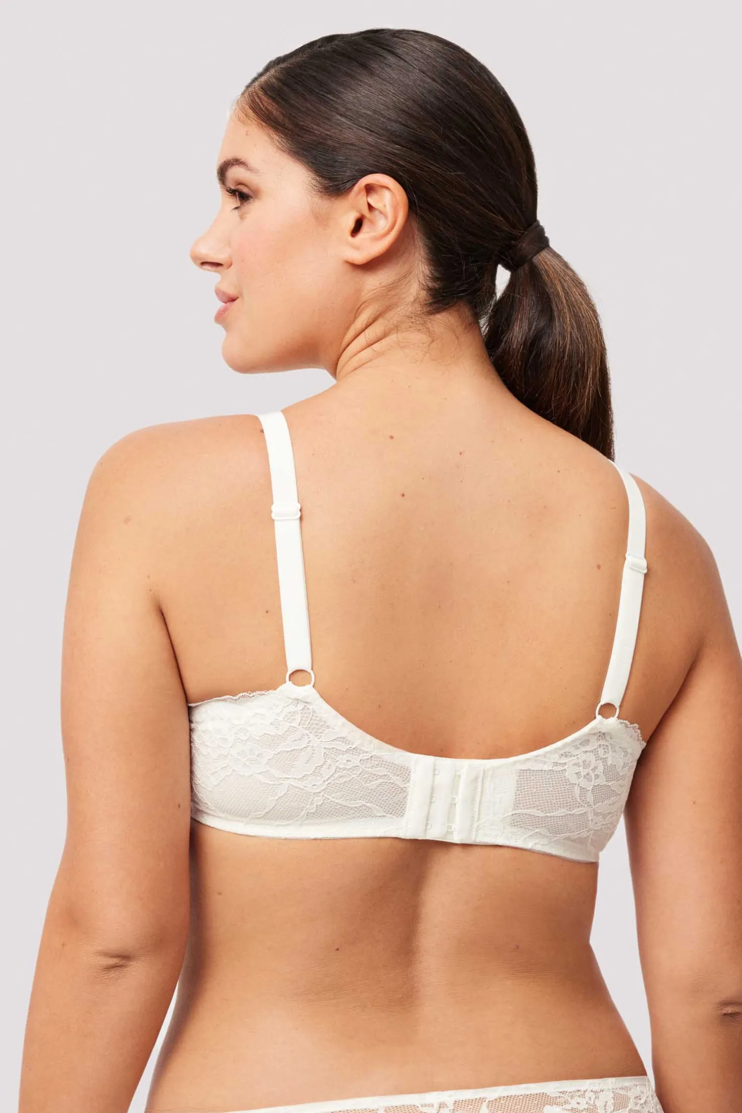 Nuestro brasier de encaje sin relleno no solo es elegante, también es práctico. Con aros para ofrecerte un soporte seguro y una espalda anatómica reforzada que ofrece una sujeción adicional, te sentirás cómoda durante todo el día. Los reguladores metálicos de los tirantes permiten que ajustes la longitud de acuerdo a tu silueta, dándote el control total sobre tu comodidad. Combínalo con una braguita a juego para crear un conjunto perfecto.