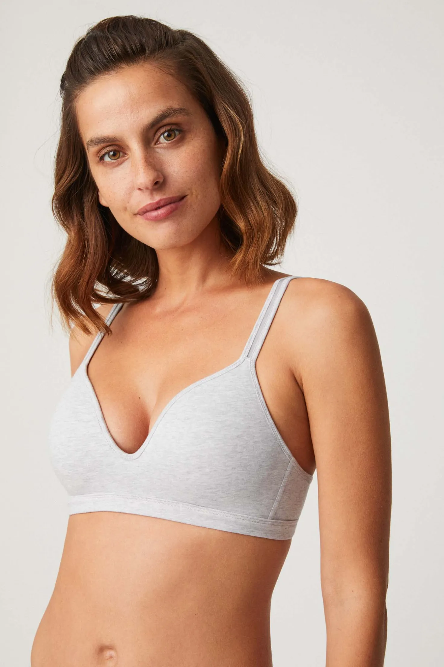 Colección Comfy. Sujetador con interior de cierre forrado. Máximo confort que evita rozaduras. Tirantes reforzados con cierres anchos metálicos. Copas de línea ondulada y continuas de efecto invisible, permiten que no marque la ropa. Elige una braguita de la colección Special You y completa tu set lencero. Color gris claro jaspeado.