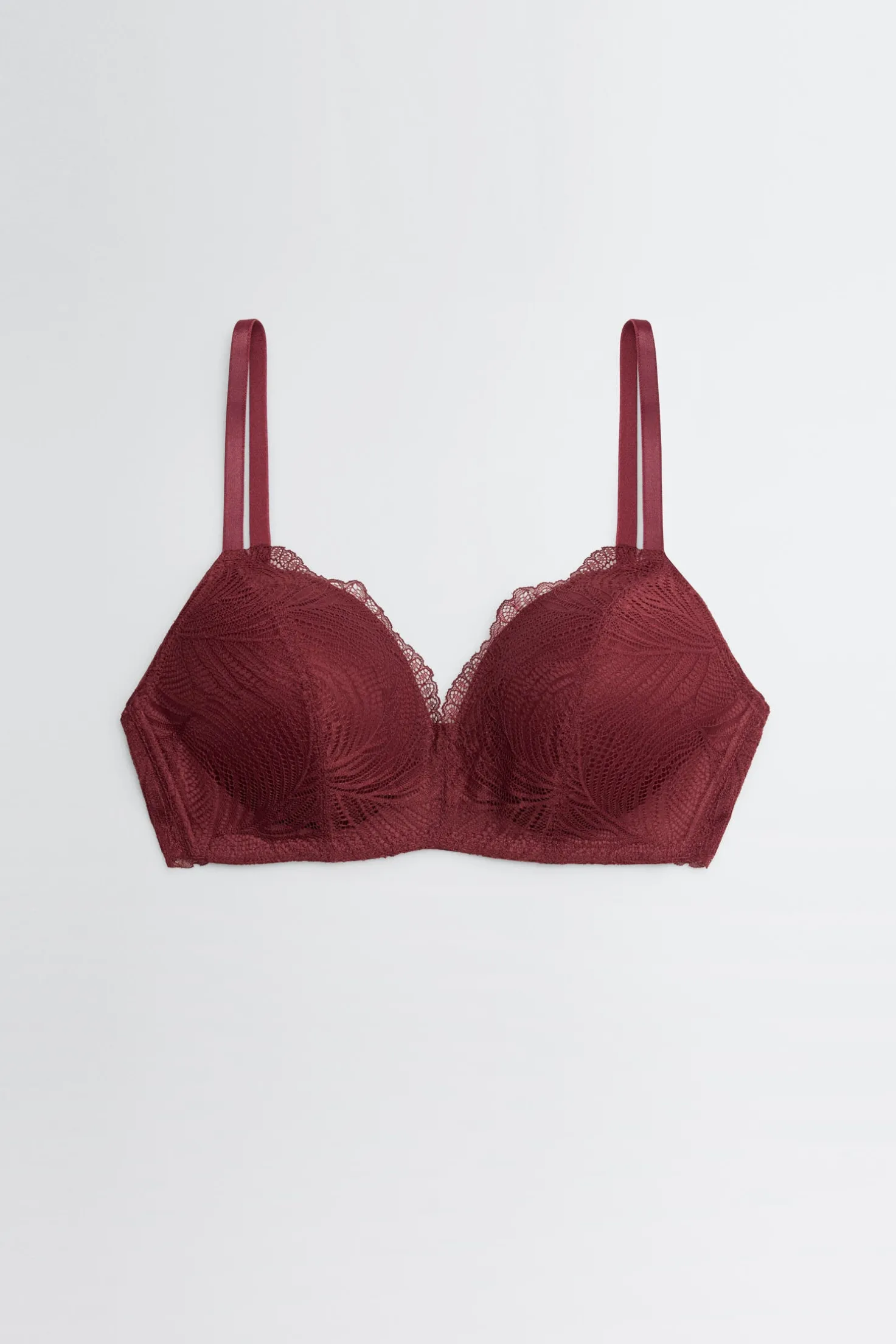 Sujetador sin aro con relleno y encaje integral en un favorecedor tono de rojo oscuro. Su diseño envuelve el pecho con suavidad, aportando forma y sujeción sin la rigidez del aro. Un básico cómodo y femenino para el día a día. Copa B. Combínalo con una braga o tanga a juego y completa tu look de lencería.