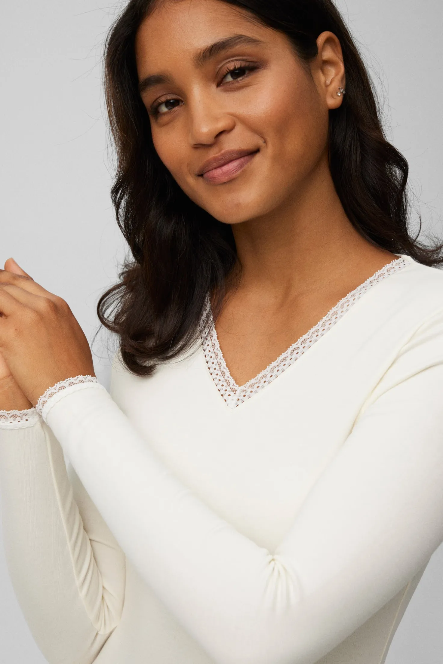 - Cuello pico con detalle de encaje. Un refinado acabado de encaje en el cuello pico que aporta un toque de elegancia y distinción, ideal tanto como capa interior como prenda exterior.