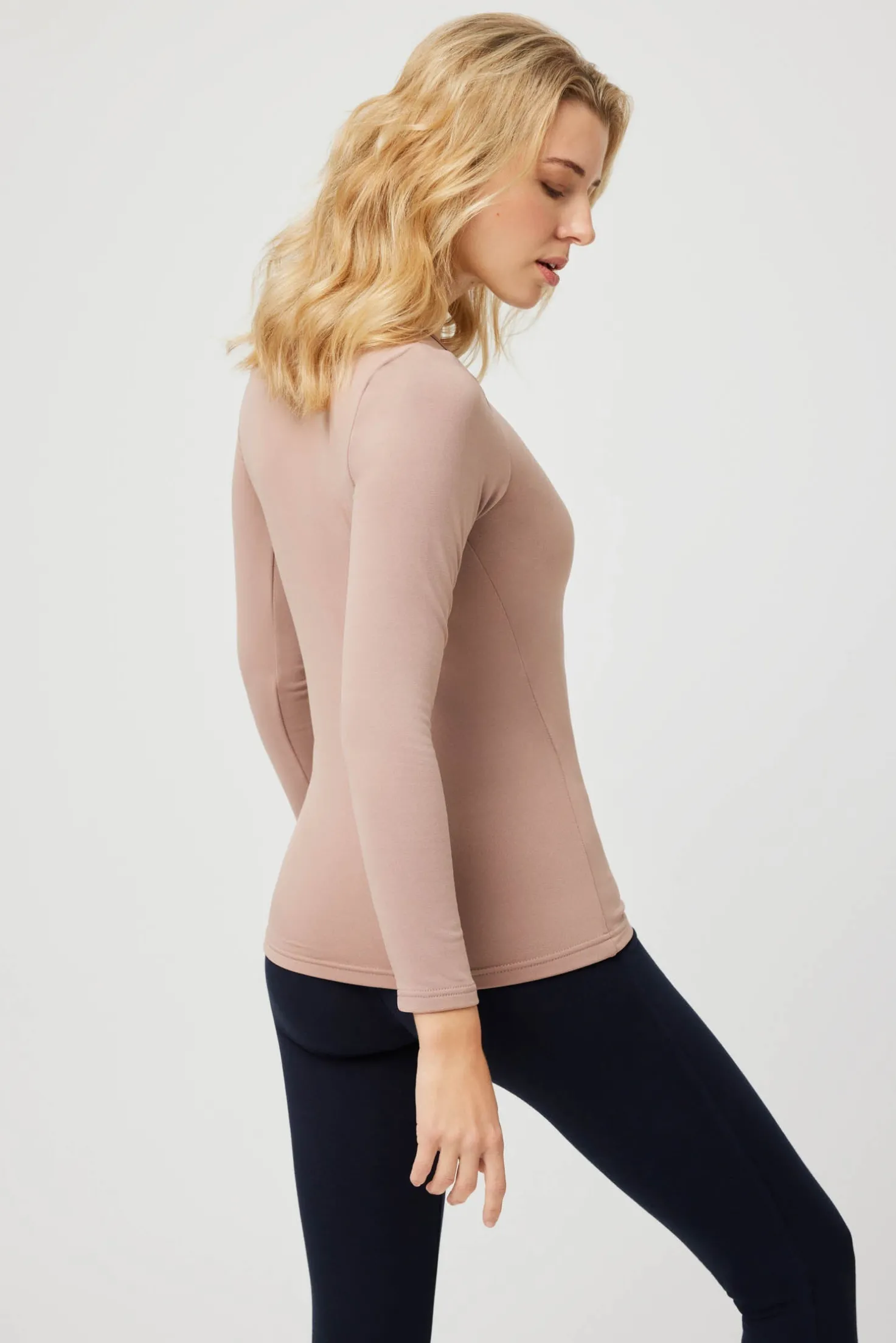 Camiseta térmica de manga larga para mujer, ideal para mantener una temperatura confortable en días fríos gracias a su nivel de termicidad. Confeccionada en tejido térmico suave y agradable al tacto, ofrece un ajuste ceñido que favorece la retención de calor y la comodidad bajo cualquier prenda. Su diseño básico y liso, junto con el cuello redondo, la convierte en una prenda versátil para el uso diario durante el invierno.