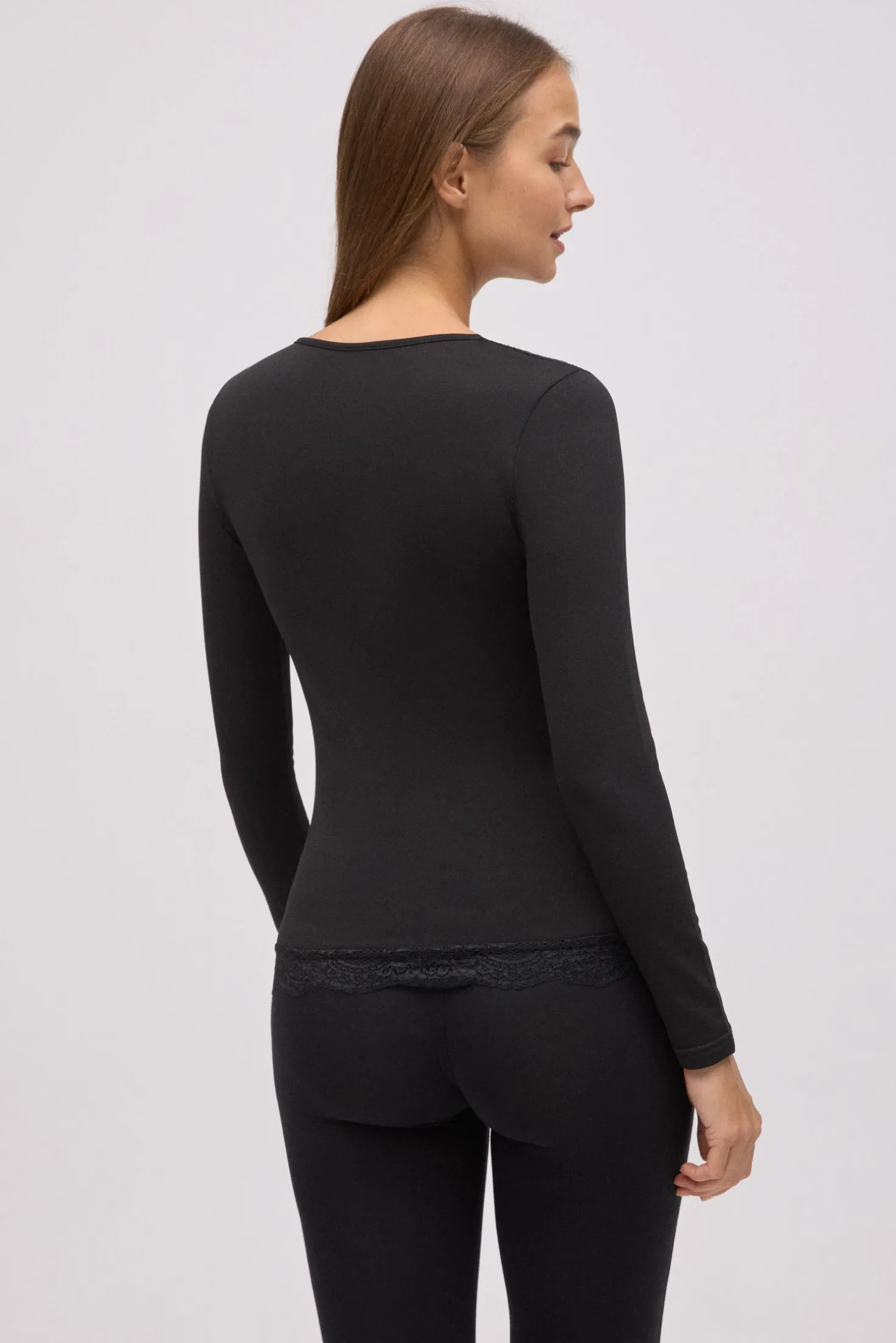 Camiseta térmica de manga larga para mujer con cuello pico y detalles de encaje, que aportan un toque femenino y elegante. Confeccionada en tejido térmico suave con interior afelpado, ideal para mantener el calor de forma confortable durante los días fríos. Su diseño liso y el detalle de encaje en el bajo la convierten en una prenda versátil y especial, perfecta para usar como interior o para lucir en looks casuales de invierno.
