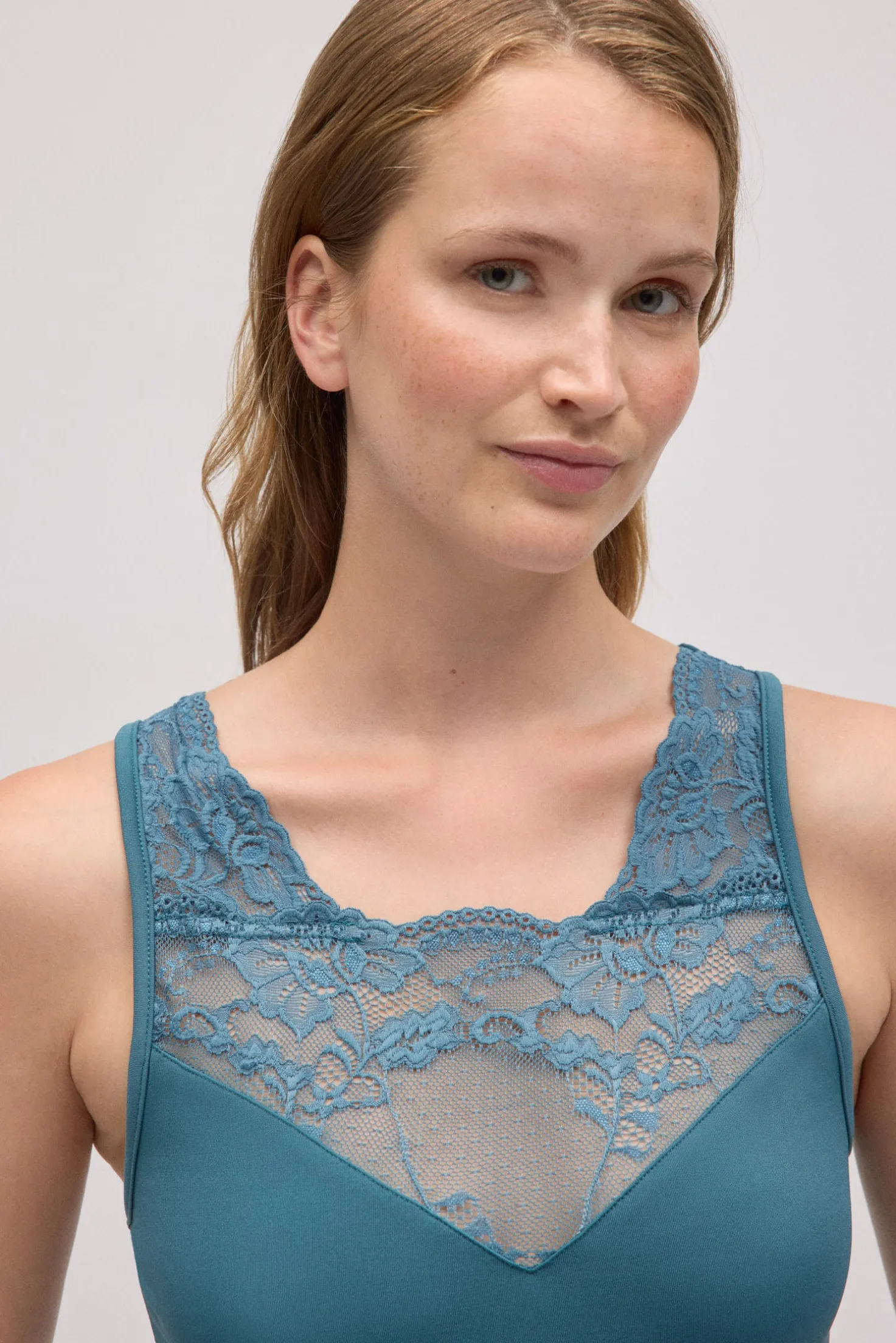 - Diseño liso con elegante encaje en el escote.