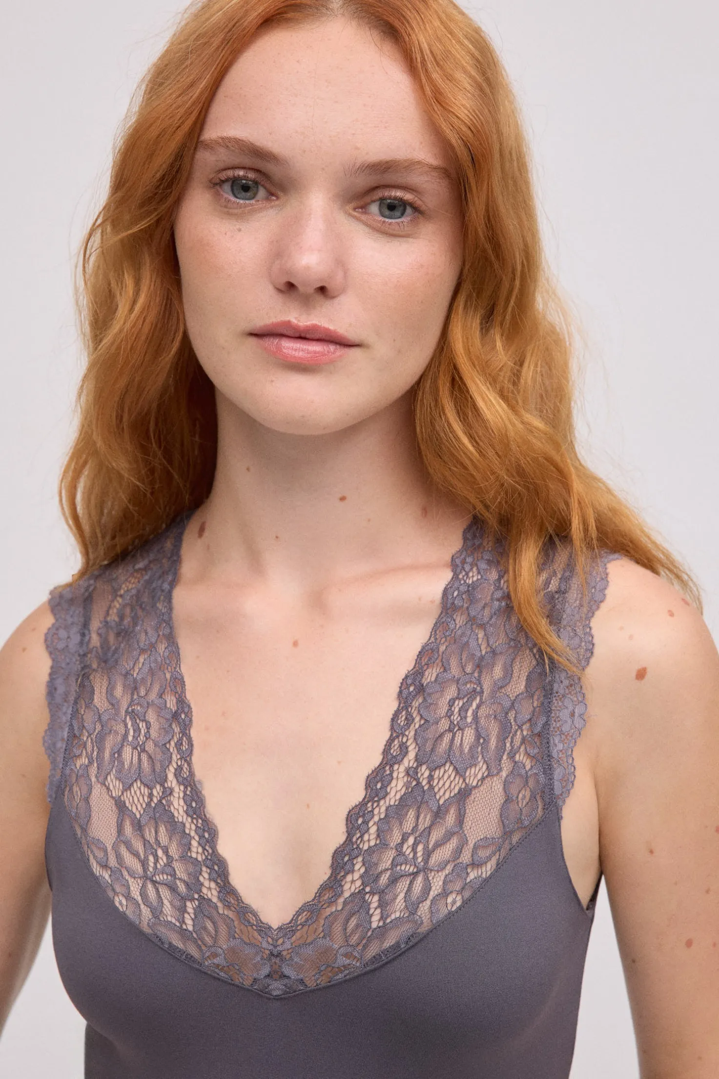 Camiseta térmica tirantes con cuello pico y detalles de encaje
