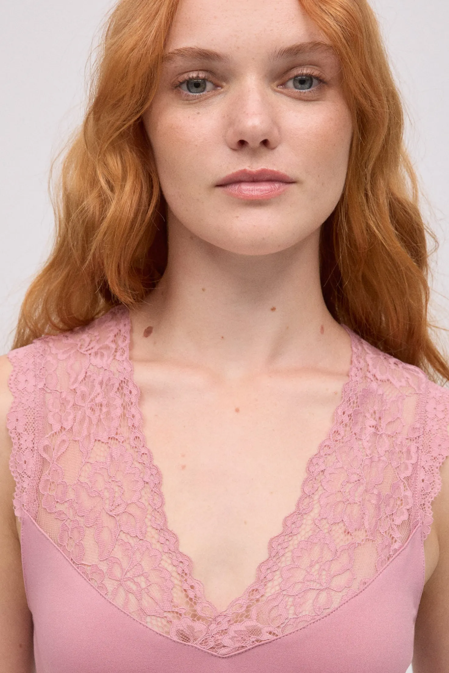- Detalle de encaje en el escote para un acabado sofisticado.