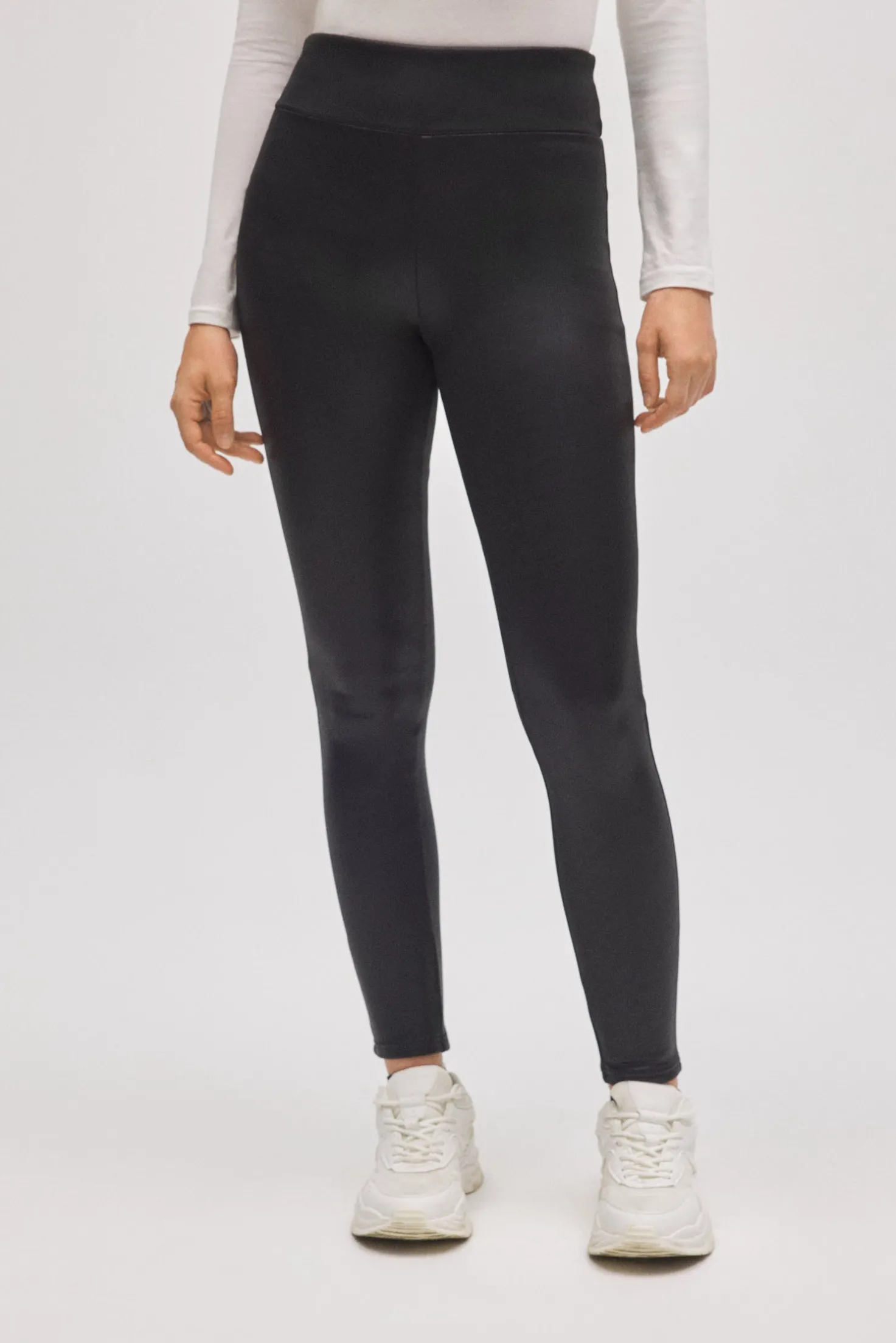 Leggings térmico efecto piel con goma ancha de talle alto y acabado efecto cuero. Una prenda versátil ideal para climas fríos.