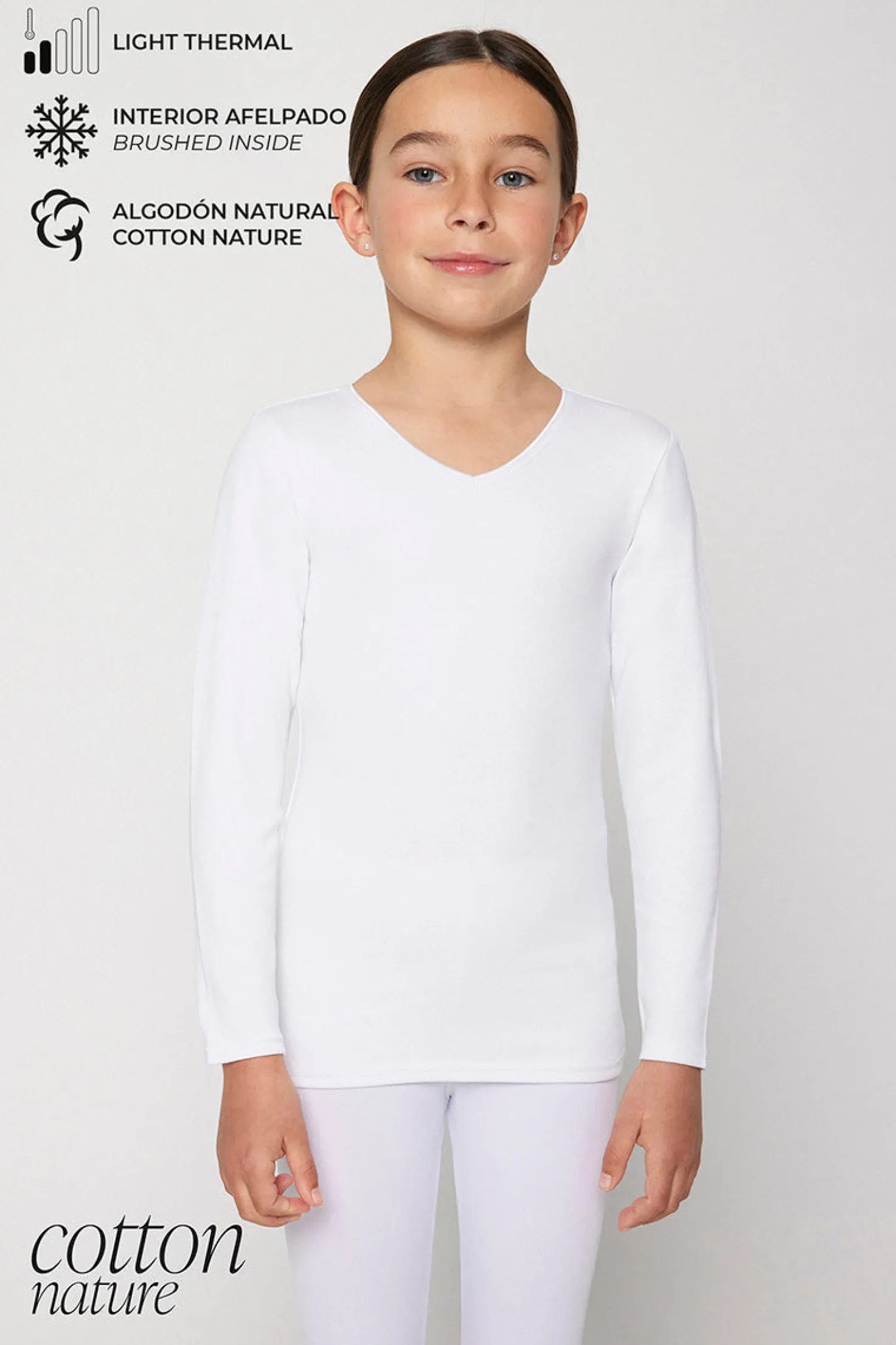 Camiseta térmica de manga larga para niños, confeccionada con algodón suave y interior afelpado, diseñada para aportar calidez ligera en días frescos. Ideal como capa base para mantener la temperatura sin añadir volumen.