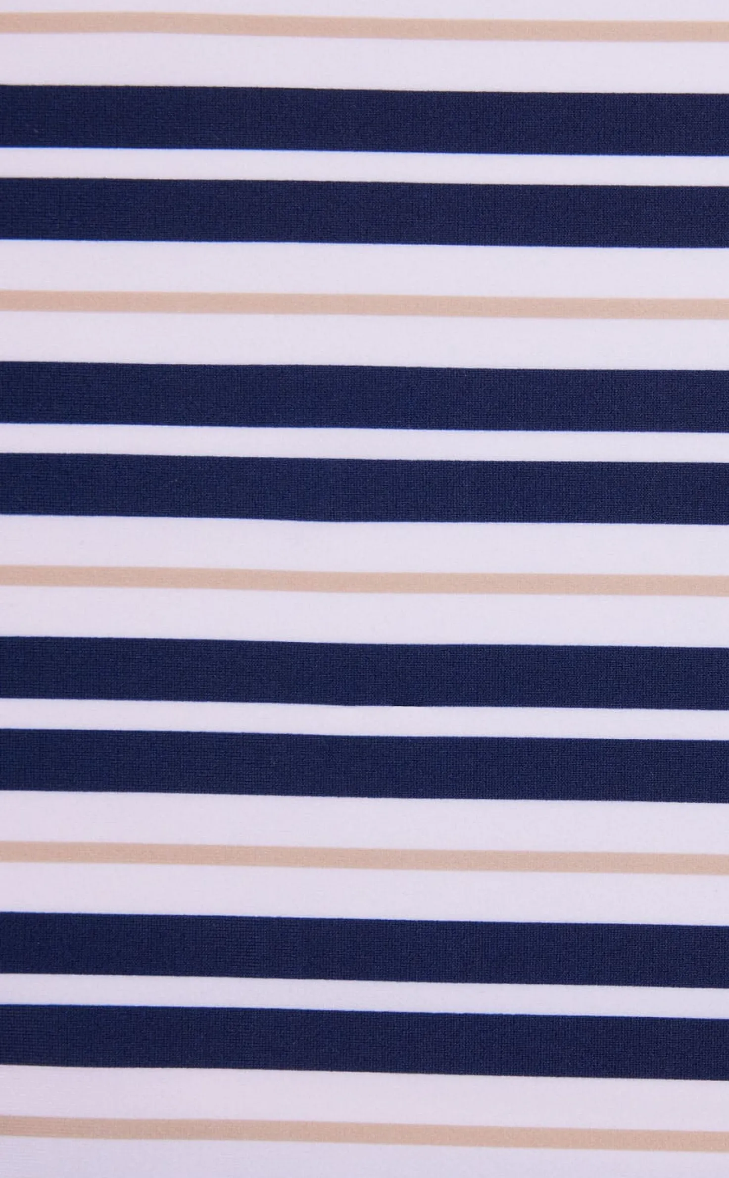 Top de bikini reductor de capacidad diseñado para ajustarse a la perfección. Gracias a su diseño y patrón, consigue evitar la proyección del pecho hacia delante. Su detalle estampado de rayas en la parte superior añade un toque elegante y sofisticado.